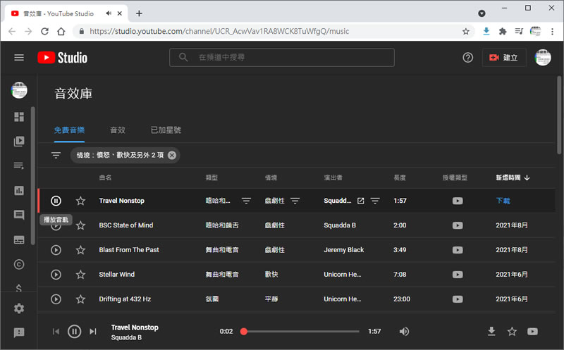 首頁免費素材配樂音效 快來 「YouTube Studio 音效庫」 為影片配上 MP3 音樂或音效,完全免費 製作影片時,難免會需要用到一些音效或是襯底的背景音樂,讓影片可以更有可看性或娛樂性,這些背景音樂要去哪裡找呢?現在你可以不用在傷腦筋了,透過 Google 「YouTube Studio 音效庫」 ,就可以免費下載 Google 所為你精挑細選高音質的 MP3 影片背景音樂、音效,YouTube 還將這些背景音樂做了相當詳盡的分類,像是憤怒、歡快、平靜、灰暗、戲劇性、放克、開心、鼓舞人心、浪漫、悲傷,使用者可以從線上試聽,滿意就下載,完全免費。 🔔 不錯過任何精彩! 立即訂閱我們的 LINE 官方帳號 每次發佈新文章時,您將會第一時間收到本站文章連結通知,輕鬆掌握最新資訊! 使用 LINE 追蹤文章更新 §相關文章,還可以參閱:小森平的免費下載音效:免費音效素材寶庫,個人及商用皆可的授權模式PopPop AI Sound Maker:線上 AI 音效產生器,免費將文字描述轉換為音效FindSounds:專注於音效搜尋的免費平台,快速找到想要使用的音效効果音ラボ:免費且可商用的音效素材網站,涵蓋戰鬥、生活、環境音、自然與動物等SoundGator:免費音效素材網站,提供多種類型的短音效下載 如何使用 Google 「YouTube Studio 音效庫」 ? 1.說是完全免費,還是要來看看使用條款及細則。 2.根據 使用音效庫中的音樂和音效 的說明,「YouTube 音效庫裡的音樂和音效沒有版權疑慮。音效庫是我們獨家提供的資源,只能在 YouTube 工作室中使用」。 3.清楚知道使用規範後,我們就可以點擊篩選器來尋找適合影片的音樂或音效。 4.篩選出的音樂列表,每首都可以試聽與下載。 YouTube Studio 音效庫網站網址:https://studio.youtube.com/channel/UCR_AcwVav1RA8WCK8TuWfgQ/music