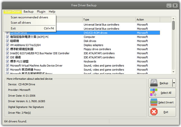 首頁電腦軟體備份還原 Free Driver Backup 驅動程式備份免費工具 不管是新安裝或是重新安裝電腦的作業系統,當要使用電腦上的周便設備時,便是要有驅動程式,這些驅動程式通常都是燒錄在 CD片附加在電腦剛買進的包裝盒內,若是不見了,還是可以到硬體廠商的網站下載。不過這樣很麻煩,不但要比對電腦型號,若是組裝的還得知道該元件的名稱、型號......,若能在安裝電腦前,透過 Free Driver Backup 將原本的驅動程式備份下來,完成安裝後,便能一一安裝回去,那就節省很多時間了。 🔔 不錯過任何精彩! 立即訂閱我們的 LINE 官方帳號 每次發佈新文章時,您將會第一時間收到本站文章連結通知,輕鬆掌握最新資訊! 使用 LINE 追蹤文章更新 §相關文章,還可以參閱:Windows Activation Key Viewer 找出已啟用的 Windows 產品金鑰WebBrowserPassView 找出儲存在瀏覽器內的用戶名稱與密碼Zback 資料夾備份免費工具DriverHub 輕鬆解決在 Windows 中安裝或更新驅動程式的困擾Wise Windows Key Finder 將 Windows、Windows Server 和 Office 的產品金鑰找出來 如何使用 Free Driver Backup? 1.完成安裝,開啟 Free Driver Backup 後,點擊[Scan Driver] > [Scan all drives]來掃描所有的驅動程式,掃描完成後,會將驅動程式一一列在列表內,點擊驅動程式,下方欄便會列出陽系的資訊。 2.勾選或點擊[Select All]來選擇要備份的驅動程式項目,接下來在點擊[Backup],便可開始備份。完成後,點擊[Back up] > [Browse Backup Folder ]來開啟備份所在的資料夾。 3.另外, Free Driver Backup 也提供 Cookies 及瀏覽器 - 我的最愛與註冊表備份。 Free Driver Backup版本:9.4.5語言:英文性質:免費適用:Windows官方網站:http://www.freedriverbackup.com/下載:按我下載