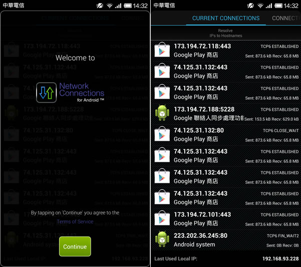 首頁移動設備系統應用 Network Connections 輕鬆監控 Android 所有傳入和傳出的網絡連接 對於可以使用 3G 或 Wifi 上網的智慧型手機或平板電腦而言,常會搞不清楚系統或所裝的應用程式,在什麼時候會使用網路連接或使用了多少的網路流量,再者,要是自己知道所安裝應用軟體還好,要是有些莫名其妙的惡意軟體也在使用網路,那可就需要注意了。想要知道使用 Android 系統的手機或平板電腦在網路連接的使用情形時,可以安裝 Network Connections 來輕鬆監控在 Android 系統中所有傳入和傳出的網絡連接與網路流量。 🔔 不錯過任何精彩! 立即訂閱我們的 LINE 官方帳號 每次發佈新文章時,您將會第一時間收到本站文章連結通知,輕鬆掌握最新資訊! 使用 LINE 追蹤文章更新 §相關文章,還可以參閱:「Android」如何關閉或開啟「智慧助手」?[ Android ]如何更改預設的瀏覽器?如何使用 Android 系統中內建的 VPN 功能進行 VPN 連線?如何查詢 Android 系統上的 Edge、Chrome 瀏覽器是 32還是 64位元?如何開啟 Android 系統內隱藏的「開發人員選項」功能,方便手機調校? 如何使用 Network Connections? 1.開啟 Network Connections 後,點擊[Continue]進入 Current Connections 頁籤,該頁籤所顯示目前所有使用網路連接的程序(包含 Android 系統本身與所裝應用程式),並會統計所使用的上傳與下載流量統計。 2.向左滑動頁籤,可進入 Connections Log 頁面,該處顯示連接的歷史紀錄,並可點擊[Start Live Capture]或[Stop Live Capture]來開始或停止擷取即時連接的資料。 3.同樣向左滑動到 APP Network Log 頁面,該頁面會顯示所裝應用程式的網路連接資料;針對每項連接數據,點擊後,都可得到詳細的資料。 4.Settings 頁籤,可讓我們設定 Network Connections 的使用參數,包含即時的數據擷取、提示、資料庫...等等。 Network ConnectionsAPP性質:免費官方網站:https://play.google.com/store/apps/details?id=com.antispycell.connmonitor&utma=xd