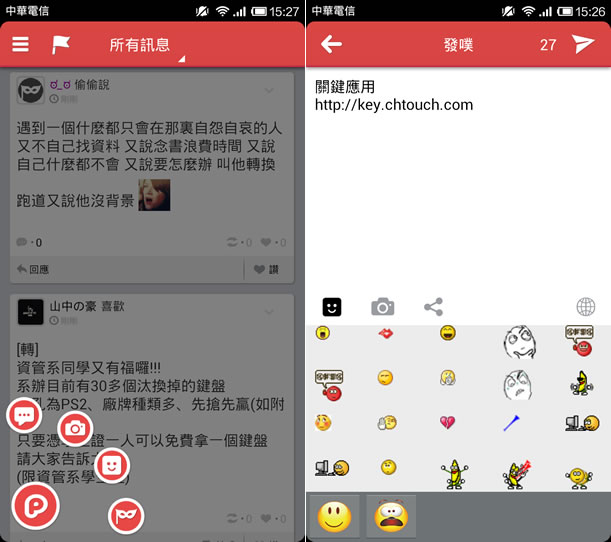 3.想要發表訊息時,可透過頁面左下角的 P 符號,來選擇要發表的訊息類型;也可以應用表情符號。