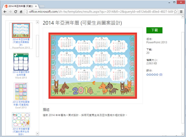 首頁線上工具上傳下載 2014年 Microsoft Office(Word、Excel、PowerPoint) 行事曆與月、年曆下載 若要製作中華民國 103年、西元 2014年的行事曆,可到微軟 Office 的範本藝廊來下載,有 Word、PowerPoint、Excel、Publisher 等格式,使用 Office 各版本所製作,除了常見的樣式外,也有相片、兒童年曆、年、月複合式行事曆、簡易月曆 (附農曆,每個月一頁)、月曆 (週日至週六,含農曆)...相當多樣式,可供挑選。 🔔 不錯過任何精彩! 立即訂閱我們的 LINE 官方帳號 每次發佈新文章時,您將會第一時間收到本站文章連結通知,輕鬆掌握最新資訊! 使用 LINE 追蹤文章更新 §相關文章,還可以參閱:M3U8 Player:本地瀏覽器處理,播放、下載、轉 MP4 一站免費完成getM3U8 免費線上工具:輕鬆下載 M3U8 串流影片並轉檔 MP4SnapWC 免費影片下載器:一鍵搞定 YT、IG、FB、抖音等 10,000+ 平台影片、音訊、圖片需要分享圖片連結?試試 PiXhost 免費圖床服務P2PFileShare 線上 P2P 傳檔免費工具,免安裝無檔案大小限制直接瀏覽器傳輸 如何下載 Microsoft Office 2014年各樣式月、年曆? 1.進入前述網址後,便可看到各樣式的列表。 2.找到自己喜愛的樣式後,點擊該樣式即可預覽、下載。 Office 範本藝廊官方網站:http://office.microsoft.com/zh-tw/templates/results.aspx?qu=2014&ex=1&tl=2