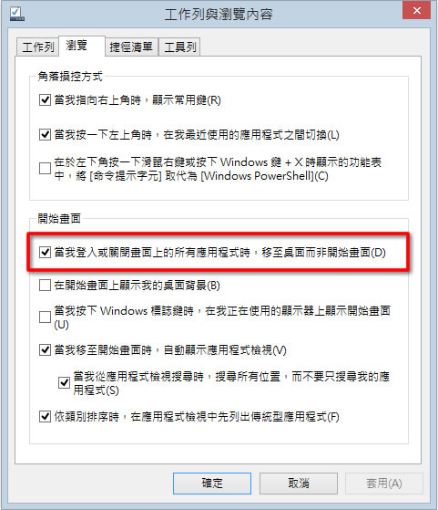 首頁操作技巧Windows 如何讓 Windows 8.1 開機時直接進入傳統桌面? Windows 8 推出後,其最大的改變就是多了有動態磚的開始畫面與取消了[開始]按鈕,這樣的改變讓多數的使用者感到不習慣,甚至於不願安裝或升級,只願意停留在 Windows 8 之前的版本,不過,隨著 Windows 8.1 的推出,不但讓[開始]按鈕重出江湖行走,動態磚的開始畫面也只要經過勾選的簡單設定動作,便可快速的直接進入傳統的桌面。 🔔 不錯過任何精彩! 立即訂閱我們的 LINE 官方帳號 每次發佈新文章時,您將會第一時間收到本站文章連結通知,輕鬆掌握最新資訊! 使用 LINE 追蹤文章更新 §相關文章,還可以參閱:學起來!微軟親授 10 個提升 Windows PC 效能的技巧如何升級 Windows 11 25H2?最新版本功能亮點與完整更新步驟Windows 工作列時鐘顯示秒數:真的會影響電池續航力嗎?LTT Labs 完整實測解析Windows 快速取出資料夾檔案名稱清單!內建功能輕鬆搞定,不用額外軟體Windows 11 如何縮小工作列圖示按鈕,打造更精簡桌面視覺 如何讓 Windows 8.1 開機時直接進入傳統桌面? 1.先切換回傳統桌面,並使用滑鼠右鍵按桌面下方的工作列空白處,接著在出現選單視窗上點選[內容]。 2.在[瀏覽]頁籤處勾選「當我登入時顯示桌面,而不要顯示開始畫面」後,點擊[確定]。 當再次開機後,便會直接進入傳統的桌面上。