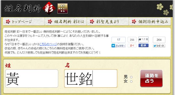首頁線上工具生活資訊 「姓名判断 彩」 - 日本姓名吉凶分析免費網站 多數人在寶寶出生要命名的時候,免不了會找個算命師或是買本姓名學的書來協助寶寶命名,原因無它,就是習俗上有姓名會影響人一生的運勢,不過就命理師的角度來看,姓名還是要搭配出生年月日的。如果想要單純的知道姓名吉凶,也可以翻開農民曆來自己算算,或是來日本製作的「姓名判断 彩」這個網站輸入自己的名字分析看看。 🔔 不錯過任何精彩! 立即訂閱我們的 LINE 官方帳號 每次發佈新文章時,您將會第一時間收到本站文章連結通知,輕鬆掌握最新資訊! 使用 LINE 追蹤文章更新 §相關文章,還可以參閱:Apple Music 台灣新用戶優惠:6個月免費暢聽,領取方式與限制一次看!2026春節追劇清單!Netflix 2月必看攻略:燒腦推理、火爆動作片,陪你從初一爽追到開工!459 萬人搶 60 萬份!運動幣中獎號碼公布,快查你的身分證尾數都馬一起GO!LINE GO新年優惠最高拿$800優惠券,還有一個月乘車金等你抽過年搭高鐵自由座要排多久?看LINE就知道 台灣高鐵×LINE TODAY推出春節限定燈號預估服務 如何使用 姓名判断 彩? 1.使用瀏覽器進入上述網站,在方框中輸入要分析的姓、名與點選旁邊的性別後,點擊方框旁的按鈕。 2.等候下,姓名分析馬上出現。 3.用 Goolge 翻譯。 姓名判断 彩網站網址:https://namaeuranai.biz/