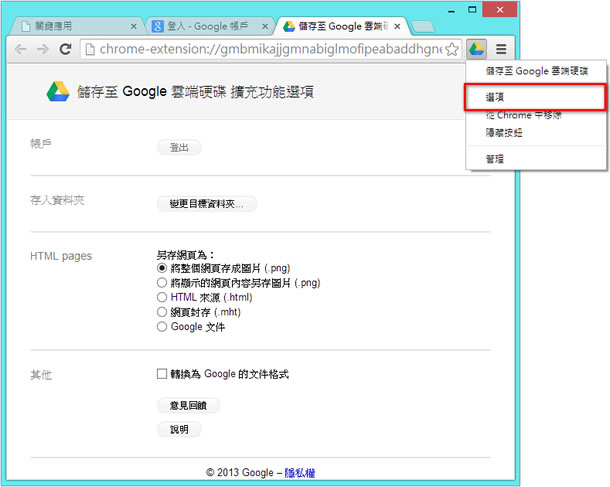 首頁瀏覽器擴充功能上傳下載 Save to Google Drive 快速將網頁轉成圖片並直接儲存到 Google 雲端硬碟內 - Chrome 瀏覽器擴充功能 使用 Chrome 瀏覽器在瀏覽網頁時,若碰到想保存下來的網頁或是檔案,又無適合的儲存裝置時,這時候,可以來安裝 Save to Google Drive 這個 Chrome 瀏覽器的擴充功能,充分利用雲端的便利性,輕鬆就能將網頁轉成圖片並儲存到 Google 所提供的雲端硬碟內,方便我們後續的應用,若是碰到檔案的下載連結,也同樣可下載儲存到自己的 Google Drive 中。 🔔 不錯過任何精彩! 立即訂閱我們的 LINE 官方帳號 每次發佈新文章時,您將會第一時間收到本站文章連結通知,輕鬆掌握最新資訊! 使用 LINE 追蹤文章更新 §相關文章,還可以參閱:RedNote Video Downloader:小紅書影片下載器,免費瀏覽器擴充功能DownThemAll 讓你輕鬆下載網頁內所有檔案(瀏覽器擴充功能)「貓抓」可解析串流影片 m3u8 檔案並下載成 MP4 的瀏覽器擴充功能Apple Design Resources - Apple 官方提供的各種裝置外框、圖示、字體...等設計資源免費下載使用Mobile TikTok & Downloader 抖音影片下載瀏覽器擴充功能 如何使用 Save to Google Drive 擴充功能? 1.使用 Chrome 瀏覽器到達 Save to Google Drive 安裝網址後,按下[FREE]便會開始下載及安裝。 2.安裝完成後,會出現提示。 3.接下來使用滑鼠右鍵點擊剛剛所安裝的 Save to Google Drive 圖示按鈕,並點擊[選項],便會出現功能選項。 4.接下來登入自己的雲端硬碟後,在任意網頁中,點擊 Save to Google Drive 的圖示,便會依照所設定的格式存檔。 5.從雲端硬碟開啟剛剛轉出的網頁圖片。 6.針對可下載的連結,像是軟體、音樂等檔案,也可以直接使用滑鼠右鍵點擊,然後[將連結儲存至 Google 雲端硬碟]。 Save to Google Drive性質:免費官方網站:https://chrome.google.com/webstore/detail/save-to-google-drive/gmbmikajjgmnabiglmofipeabaddhgne