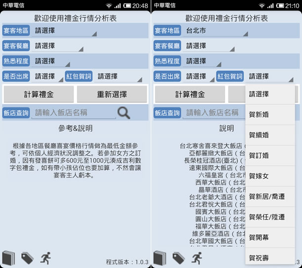 首頁移動設備生活資訊 禮金行情 - 喜宴行情價大公開(Android) 每到結婚旺季或是農曆上特別好的日子,總會接到結婚喜帖,這時候就會開始煩惱禮金該包多少,包多了,覺得沒必要,包少了,又怕太失禮,該怎麼拿捏,其實還很傷腦筋的。如果常有這樣的困擾,可以在 Android 手機上安裝「禮金行情」這個應用程式,只要輸入宴客地區、宴客餐廳、熟悉程度,是否出席......等,馬上幫你評估該包多少禮金,連紅包袋上的祝詞都幫你產生,相當方便。 🔔 不錯過任何精彩! 立即訂閱我們的 LINE 官方帳號 每次發佈新文章時,您將會第一時間收到本站文章連結通知,輕鬆掌握最新資訊! 使用 LINE 追蹤文章更新 §相關文章,還可以參閱:停車不再靠運氣!用 LINE「雞來客棧_GLike」機器人 3秒快速找車位Google Play 公布 2023 年度最佳遊戲及應用程式榜單「中央氣象局E-地震測報」APP即時掌握地震動態手機開啟 Google 搜尋「Pac-Man」就讓 Hello Kitty、小精靈、布丁狗及動漫人物以 3D 出現在現實環境中手機開啟 Google 搜尋動物名稱,就可利用 AR 技術將其融入到現實環境中 如何使用 「禮金行情」Android App? 1.開啟後,填入應用程式上所要求的欄位。 2.完成後點擊[計算禮金],在下方就會顯示所建議的禮金與賀詞。 禮金行情APP性質:免費官方網站:https://play.google.com/store/apps/details?id=com.inforton.redpacket