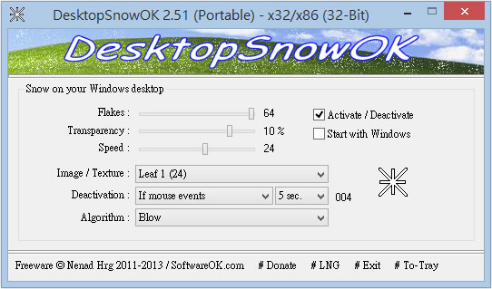 首頁電腦軟體視窗桌面 DesktopSnowOK 讓桌面有雪花飄 台灣會下雪的地方不多,即便是想賞雪,除了老天要幫忙外,接下來還要忍受塞車之苦。若想要在桌面造出一個下雪的景象時,可以來試試 DesktopSnowOK 這個免安裝的應用程式,除了可以在桌面造出各式各樣的雪花外,其他像是星星、花朵、愛心、落葉......等等,不但可以調整若下的密集度、速度,還可以調整飄落的上、下方向。 🔔 不錯過任何精彩! 立即訂閱我們的 LINE 官方帳號 每次發佈新文章時,您將會第一時間收到本站文章連結通知,輕鬆掌握最新資訊! 使用 LINE 追蹤文章更新 §相關文章,還可以參閱:Windows 官方桌布商店來了!超過 400 款風格包,從遊戲到國家公園通通有微軟 City Art Search 自動將 10400多幅世界名畫設置成 Windows 鎖定螢幕畫面Digital Clock 4 可靈活自訂的桌面時鐘,支援報時、計時器、鬧鐘等多款附加套件TrafficMonitor 在 Windows 桌面上顯示網路上傳與下載的即時網速「免費下載」故宮博物院 2023 兔年月曆桌布 如何使用 DesktopSnowOK ? 1.開啟 DesktopSnowOK 後,可依據所需調整飄落物的密度、速度......等等。 2.桌面飄落樣式。 DesktopSnowOK版本:6.12語言:英文性質:免費適用:Windows官方網站:https://www.softwareok.com/?seite=Freeware/DesktopSnowOK下載:按我下載