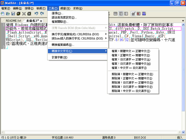 覺得 Windows 內建的記事本軟體太陽春嗎?那麼可以試試 MadEdit 這套免費軟體,除了原有的記事本功能外,支援多分頁開啟,若用來編寫程式還可以使用語法高亮度標記﹝C/C++,CSS, diff/patch, D, DOS Batch Script, Flash ActionScript, HTML, Java,JavaScript, JSP, Lua, Pascal, PHP, Perl, Python, Ruby, UNIX Shell Script, x86 Assembly, XML, Fortran, TeX/LaTeX, Squirrel, C#, Visual Basic, ASP(VBScript), SQL, Verilog, VHDL﹞、支援多種編碼(Big5,GBK,UTF-8/16/32)並可隨時改變編碼、十六進位/區塊模式、正規表達式的搜尋或取代、字數計算、簡繁體互換...等。
