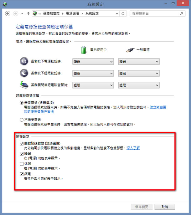 首頁操作技巧Windows Windows 8.1 如何快速開機或關機? 無論是 Windows 8 或 8.1,其開關機的速度相比之前的 Windows 版本,都能有感的且實際的享受到,當然,這也需要硬體的速度跟得上,若是在較早期的電腦上安裝,有感的幅度,可能體驗就會稍差了。想要加速開 / 關機的速度,可以來檢查在控制台的設定值,並適時的調整,以取得更好的體驗值。 🔔 不錯過任何精彩! 立即訂閱我們的 LINE 官方帳號 每次發佈新文章時,您將會第一時間收到本站文章連結通知,輕鬆掌握最新資訊! 使用 LINE 追蹤文章更新 §相關文章,還可以參閱:你的 Windows 筆電是真睡還是裝睡?一個設定終結背包發熱耗電學起來!微軟親授 10 個提升 Windows PC 效能的技巧如何升級 Windows 11 25H2?最新版本功能亮點與完整更新步驟Windows 工作列時鐘顯示秒數:真的會影響電池續航力嗎?LTT Labs 完整實測解析Windows 快速取出資料夾檔案名稱清單!內建功能輕鬆搞定,不用額外軟體 如何快速開機或關機? 1.以 Windows 8.1 為例,按下[Windows + X]快速鍵,來開啟控制台。點擊[系統及安全性]。 2.接下來依序點擊[電源選項] > [選擇按下電源按鈕時的行為]。 3.接下來先點擊[變更目前無法使用的設定]。 4.適時的調整選項值。