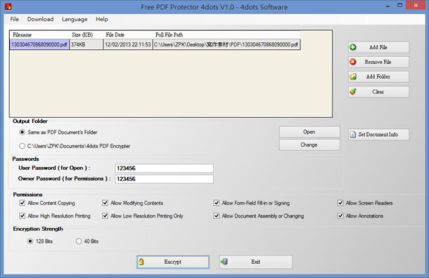 首頁電腦軟體文書編輯 Free PDF Protector 4dots 設定 PDF 檔案開啟密碼與保全 有很多的免費軟體,可協助我們將文件轉存成 PDF 檔案格式,甚至於是 Google、Microsoft 等大廠在其文書編輯應用軟體也都內建有此功能,因此,想要製作 PDF 文件是件相當容易的事情,不過,PDF 文件是製作出來了,但卻無法對這些文件進行開啟密碼的設定與禁止列印、複製......等等的保全設定,有點閹割了 PDF 的好處。想要將製作好的 PDF 文件進行密碼與保全設定時,可以來試試 Free PDF Protector 4dots 這套可批次又免費的應用軟體。 🔔 不錯過任何精彩! 立即訂閱我們的 LINE 官方帳號 每次發佈新文章時,您將會第一時間收到本站文章連結通知,輕鬆掌握最新資訊! 使用 LINE 追蹤文章更新 §相關文章,還可以參閱:PDF Arranger 可調整順序、刪除、旋轉...的多功能 PDF 工具程式Text Replacer 文字替換免費工具如何在 PDF 文件裡添加額外的文字、圖片、圖形或繪圖?Notepad++ 免費多功能記事本軟體doPDF 可在任何程式中藉由[ 列印 ]功能來建立 PDF 檔案 如何使用 Free PDF Protector 4dots? 1.下載時需透過 CNet的下載程式進行下載與安裝,安裝過程須注意勾選,避免安裝額外不相關的功能與軟體。 ※不想安裝,請點擊[Decline] 2.開啟後,點擊[Add File]或[Add Folder]來加入或批次加入想要設定保全的 PDF 文件,並設定開啟或擁有者的密碼與勾選要限定的保全項目後,點擊[Encrypt]。 3.預設加入保全的文件會被存放到與原文件的相同路徑,開啟與查看保全設定。 Free PDF Protector 4dots版本:4.8語言:英文性質:免費適用:Windows官方網站:https://www.4dots-software.com/free-pdf-protector/下載:按我下載