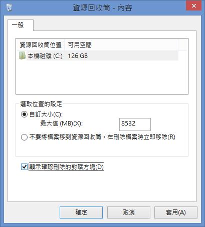 首頁操作技巧Windows 如何在 Windows 8 刪除檔案時加入確認視窗? 在 Windows 8 之前版本進行檔案刪除時,都會談出一個確認視窗,來確認使用者是否真的要刪除該檔案,然而在 Windows 8 及 8.1的版本,若使用刪除功能時,會直接刪除到資源回收筒內,少了確認步驟,雖說檔案還在,但操作起來還是有些不習慣,想要加回確認視窗,其實很簡單,只要開啟資源回收筒的內容,調整一下即可。 🔔 不錯過任何精彩! 立即訂閱我們的 LINE 官方帳號 每次發佈新文章時,您將會第一時間收到本站文章連結通知,輕鬆掌握最新資訊! 使用 LINE 追蹤文章更新 §相關文章,還可以參閱:你的 Windows 筆電是真睡還是裝睡?一個設定終結背包發熱耗電學起來!微軟親授 10 個提升 Windows PC 效能的技巧如何升級 Windows 11 25H2?最新版本功能亮點與完整更新步驟Windows 工作列時鐘顯示秒數:真的會影響電池續航力嗎?LTT Labs 完整實測解析Windows 快速取出資料夾檔案名稱清單!內建功能輕鬆搞定,不用額外軟體 如何在 Windows 8 刪除檔案時加入確認視窗? 1.使用滑鼠右鍵按資源回收筒的圖示,再出現的快顯功能表中,點擊[內容]。 2.接下來會出現內容視窗,便可根據所需來勾選功能。