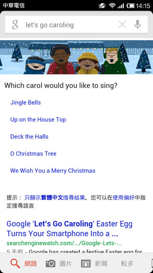 首頁移動設備生活資訊 用 Google Android 版搜尋應用程式來唱聖誕歌,還有卡拉 OK字幕歌詞帶唱 聖誕節的氣氛除了可以到百貨公司或是有辦過節活動的場合感受外,最直接的當然就是聽聽有關聖誕節的歌曲囉!像是歷久不衰最為經典的 Jingle Bells、We Wish You a Merry Christmas、O Christmas Tree......等,想要聽這些聖誕節的歌曲,這次 Google 都幫你準備好了,可不是只有準備讓你聽喔!,還搭配卡拉 OK 般的字幕帶著你一起來唱。 🔔 不錯過任何精彩! 立即訂閱我們的 LINE 官方帳號 每次發佈新文章時,您將會第一時間收到本站文章連結通知,輕鬆掌握最新資訊! 使用 LINE 追蹤文章更新 §相關文章,還可以參閱:停車不再靠運氣!用 LINE「雞來客棧_GLike」機器人 3秒快速找車位Google Play 公布 2023 年度最佳遊戲及應用程式榜單「中央氣象局E-地震測報」APP即時掌握地震動態手機開啟 Google 搜尋「Pac-Man」就讓 Hello Kitty、小精靈、布丁狗及動漫人物以 3D 出現在現實環境中手機開啟 Google 搜尋動物名稱,就可利用 AR 技術將其融入到現實環境中 如何用 Android 手機聽 Google 幫你準備的五首聖誕節歌曲? 1.在手機上開啟 Android版的 Google 搜尋應用程式,輸入「 let's go caroling 」搜尋後,接下來就會看到這五首跟聖誕節有關的歌曲。 2.點擊就播放,歌詞會顯示在下方,紅色會標示歌曲目前所唱到的歌詞,用以引領你跟著一起唱。