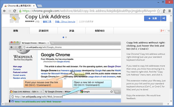 首頁瀏覽器擴充功能網頁瀏覽 Copy Link Address 利用 Ctrl + C 快速複製網頁內所含網址 - 瀏覽器擴充功能 不論是使用微軟的 IE 瀏覽器或是 Google 的 Chrome 瀏覽器,若是想要複製網頁中所含的網址連結,通常需要使用滑鼠右鍵點擊該連結後再按[複製捷徑]或[複製連結網址]才能取得,並無法利用 Windows 內建的 Ctrl + C 快速鍵。若常需要複製網頁中的連結,可以來來試試 Copy Link Address 這個 Google Chrome 瀏覽器擴充功能,只要將滑鼠指到要複製的網址連結,便可利用 Ctrl + C 快速複製該網址。 🔔 不錯過任何精彩! 立即訂閱我們的 LINE 官方帳號 每次發佈新文章時,您將會第一時間收到本站文章連結通知,輕鬆掌握最新資訊! 使用 LINE 追蹤文章更新 §相關文章,還可以參閱:Font Finder & Style Detector 網頁字型搜尋與樣式偵測器,免費瀏覽器擴充功能MarkX 將網頁所選文字內容儲存成書籤,提供關鍵字搜尋功能U-Eyes 移動設備瀏覽網站模擬器,可擷取網頁成圖片與錄製螢幕Live CSS Tester 在任何網頁注入 CSS 進行即時測試Quick History 以網站角度快速檢視該網站的瀏覽紀錄(瀏覽器擴充功能) 如何安裝及使用 Copy Link Address ? 1.使用 Chrome 瀏覽器到達 Copy Link Address 安裝網址後,按下[免費]便會開始下載及安裝。 2.安裝完成後,會出現提示。 3.當有複製網頁內含網址的需求時,只需將滑鼠移到要複製的連結上後,案 Ctrl + C快速鍵即可複製。 Copy Link Address性質:免費官方網站:https://chrome.google.com/webstore/detail/copy-link-address/kdejdkdjdoabfihpcjmgjebcpfbhepmh