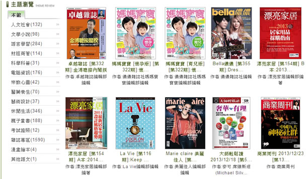 書籍電子化雖非新聞,購買電子書在 PC、 NB 或行動裝置上來閱讀的習慣,漸漸的也走向日常生活中,不過不要以為想要閱讀電子書只能付費購買,現在圖書館,也開始提供借閱電子書,想要借閱電子書,只要透過網路到圖書館的網站登入,便可借閱圖書館所提供的電子書。例如桃園縣已開放線上借閱電子書,且數量之多,範圍之廣,包含數十種的雜誌(商業週刊、遠見、儂儂、媽媽寶寶...)、倪匡系列、國家寶藏、29張當票、飢餓遊戲、Windows 8、Flash......等熱門書籍也都可以借閱,不是只有試閱幾個章節,而是提供整本可在筆記本電腦、PC、Android、IOS等裝置上閱讀。喜歡讀書的朋友千萬不可錯過這麼方便的圖書館資資源。