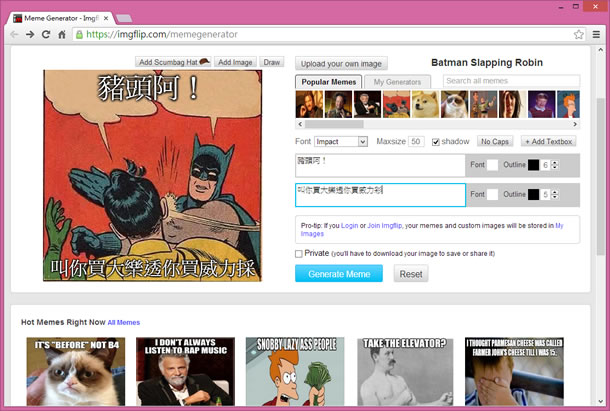 首頁線上工具影像繪圖 Imgflip 線上替圖片加入文字說明(Meme)免費服務 想要替圖片加入說明文字,不是件太困難的事情,幾乎所有的圖片編輯軟體都可以做到,重點是在於若要用傳播或行銷時,圖片的來源及其適用性,既是要行銷,當然會找大家都熟習或可適用的景物來加以編輯。Imgflip 是一個內建多種圖片,可讓你發揮創意,透過內建的編輯工具,可以輕易地將這些圖片加入文字說明,並提供圖片下載或 URL的連結,方便你後續的應用。 🔔 不錯過任何精彩! 立即訂閱我們的 LINE 官方帳號 每次發佈新文章時,您將會第一時間收到本站文章連結通知,輕鬆掌握最新資訊! 使用 LINE 追蹤文章更新 §相關文章,還可以參閱:跟著做就會!教你用 ChatGPT 製作具職業形象的漫畫風頭像Put!所見即所得的 AI 提示詞圖庫:讓你看著範例圖,複製就能做出同級作品Google 親自示範:Nano Banana AI 圖像編輯工具的 13 個熱門玩法照片角度不滿意?AI 幫你調整!3D Camera Control 讓舊照片任意變換視角Meta AI 免費帳戶也能用 Midjourney!無限生成 AI 圖片,台灣可用 如何使用 Imgflip 來產生 Meme 圖片? 1.使用瀏覽器進入 Imgflip 網站後,可點擊[Upload your own image]來上傳自己的圖片或是在 Popular Memes 頁籤中來選擇圖片,若無合適的圖片,可進入 https://imgflip.com/memesearch?q=cat 輸入關鍵字來搜尋。 2.選擇好圖片便可在圖片的右側加入適合的文字說明,若想加入多段的文字框,可點擊[+ Add Textbox]來加入。 3.加入好文字,按下[Generate Meme]之前,若不想將圖片分享出去,可勾選[Private (you'll have to download your image to save or share it)],點擊[Generate Meme]便會產生連結。 若有勾選 Private ,則會產生[Download Image],點擊便可下載。 Imgflip網站網址:https://imgflip.com/memegenerator