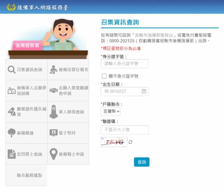 服務專線:0800-202-125(免付費,自動轉接當地縣市後備指揮部)