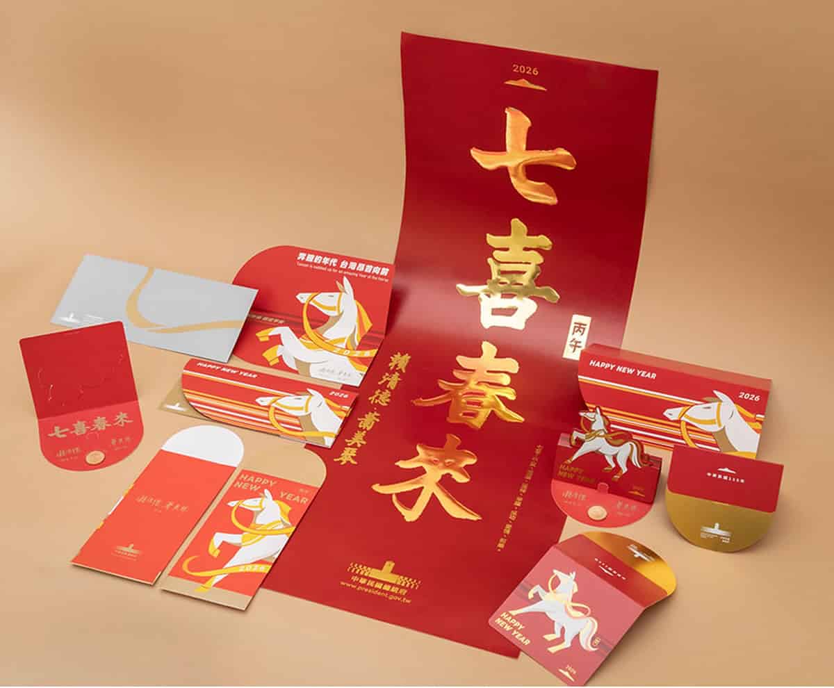 設計巧思上,「丙午」二字融入馬頭剪影,搭配玉山圖騰,象徵國家精神的高度。整體以紅金為主色調,配上昂首奔馳的白馬,寓意台灣穩健向前。