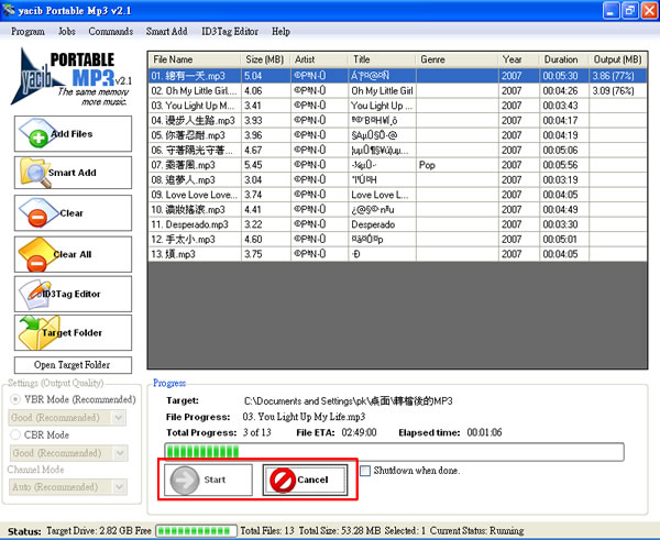 MP3 格式的檔案所佔用的硬碟空間說大不大,說小也不小,如果 MP3 檔案很多,相信還是佔了不少的空間的, yacib Portable Mp3 是一套可以將 MP3 檔案減肥且不損音質的免費軟體,這對有限的記憶卡容量或 MP3 隨身聽就可以放入更多張的專輯或數量更多的 MP3 檔案,yacib Portable Mp3 的操作上非常的容易,經過瘦身後的檔案依照所選音質高低,其大小將可以減少約 1/3 或一半,非常的實用。