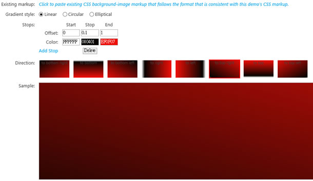 首頁線上工具開發工具 CSS Gradient Background Maker 微軟 CSS3 漸層背景產生器 以往在網頁想要利用漸層的色彩來美化時,若要使用 CSS 需要考慮地的因素很多,各家瀏覽器所支援的語法也不盡相同,需要不斷的微調,最後乾脆使用圖片一勞永逸。現在 CSS3 開始普及,想要使用漸層色彩,越見方便,CSS Gradient Background Maker 是微軟所推出利用 CSS 語法漸層背景產生器,只要選好顏色,便能產生不同漸層方向,且支援 IE、Mozilla Firefox、Opera、Safari/Chrome 等瀏覽器的 CSS 語法。 🔔 不錯過任何精彩! 立即訂閱我們的 LINE 官方帳號 每次發佈新文章時,您將會第一時間收到本站文章連結通知,輕鬆掌握最新資訊! 使用 LINE 追蹤文章更新 §相關文章,還可以參閱:網站效能健檢免費工具!PageTest 多裝置模擬效能分析及由 AI 提出改進建議Regex-Vis 圖解正則表達式的線上工具,可編寫還可驗證Sitemap Generator:線上快速產生符合 SEO 標準的網站地圖,無網址數量限制適用各類型網站網站隱私權政策產生器 Privacy Policy Generator:輸入網站名稱和網址即可輕鬆生成專屬條款Frame0:輕鬆繪製應用程式流程圖、UML 和介面雛形的免費工具,適用於 macOS 與 Windows 如何使用 CSS Gradient Background Maker? 1.使用瀏覽器進入 CSS Gradient Background Maker 網站,開始選擇所要的漸層風格。 2.若想搭配多種顏色,可點擊[Add Stop]來增加漸層顏色。 3.每個參數的調整,都會牽動 CSS markup 語法的變動,確定後,便可複製所產生的語法來應用的網頁上。 CSS Gradient Background Maker網站網址:http://ie.microsoft.com/testdrive/graphics/cssgradientbackgroundmaker/