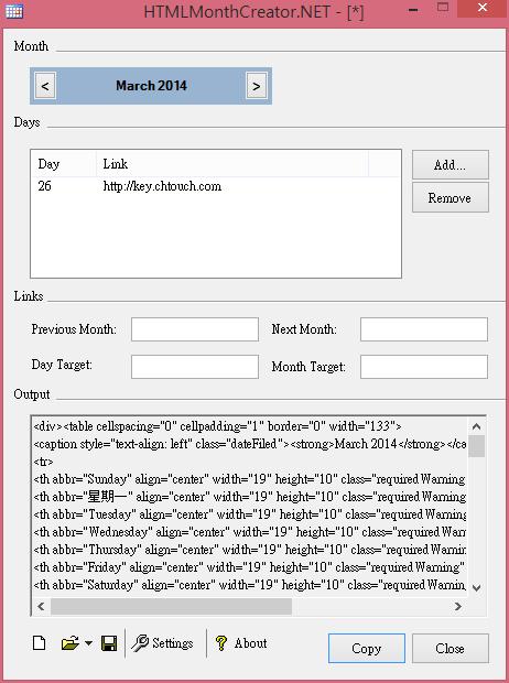 首頁電腦軟體生產力工具 HTML Month Creator Application 建立具有網址連結的月曆產生器 想要在網頁上顯示月曆,若無自有網站,可能會受到很多像是不能使用 JavaScript、iframe 等的限制。HTML Month Creator Application 是一套可自選年度月份的月曆產生器,每個月分需自行手動產生,語法為 HTML ,可替每日加入超連結, 適合不需要太複雜又須有簡單月曆功能的網頁。 🔔 不錯過任何精彩! 立即訂閱我們的 LINE 官方帳號 每次發佈新文章時,您將會第一時間收到本站文章連結通知,輕鬆掌握最新資訊! 使用 LINE 追蹤文章更新 §相關文章,還可以參閱:AingDesk:一鍵安裝 Ollama AI 模型管理器,讓 LLaMA、DeepSeek 在本機電腦上運行Arc 瀏覽器正式登陸 Windows 11,開啟全新瀏覽體驗!Norton Secure Browser 使用 Chromium 核心的瀏覽器,有廣告封鎖和隱私保護功能BingGPT 桌面應用程式,讓你不用 Edge 也能用 Bing 聊天機器人SlippyClerk 數字、英文字母有序字串產生器 可自訂前後綴字詞 如何使用 HTML Month Creator Application? 1.完成安裝開啟 HTML Month Creator Application 後,選擇要產生的年度月份;若需要為某日加入網址連結,可點擊[Add]。 2.若需要改用中文來顯示或調整顯示的大小,可點擊[Settings]來設定。 3.實際運用。 March 2014 日 一 二 三 四 五 六 1 2 3 4 5 6 7 8 9 10 11 12 13 14 15 16 17 18 19 20 21 22 23 24 25 26 27 28 29 30 31 HTML Month Creator Application版本:1.4語言:英文性質:免費適用:Windows官方網站:http://johnsadventures.com/software/htmlmonthcreator/下載:按我下載