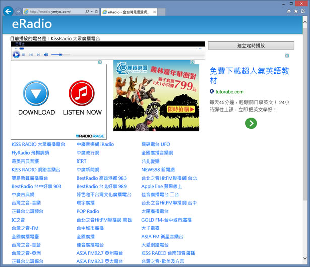 首頁線上工具影音視聽 eRadio 線上收聽台灣廣播電台 有時候想在台北收聽 KISS RADIO 大眾廣播電台或是想在台中收聽 FlyRadio 飛揚調頻廣播網,想收聽區域性的廣播電台,大概就只能透過這些電台所提供的網路直播功能。eRadio 是一個以收集台灣廣播電台有提供網路直播功能為主的網站,像是在南部口碑不錯的 KISS RADIO、桃竹苗的 FlyRadio、中廣音樂網 iRadio 、飛碟電台 UFO、中廣流行網、奇美古典音樂、ICRT、台北愛樂......等等,都可在 eRadio 網站上進行收聽,除收聽電台功能外,該網站還提供一個可預約要播放的廣播電台功能,只要設定好時間、電台,便能在該時間準時播放所喜愛的電台,讓所喜愛的廣播電台叫起床也是不錯的選擇。 🔔 不錯過任何精彩! 立即訂閱我們的 LINE 官方帳號 每次發佈新文章時,您將會第一時間收到本站文章連結通知,輕鬆掌握最新資訊! 使用 LINE 追蹤文章更新 §相關文章,還可以參閱:sound&go 耳機測試工具:免安裝測左右聲道、頻率響應Veo 3.1「材料轉影片」功能升級:支援直式影片與 4K 畫質來了!OpenAI Sora Android 版上線 Google Play,台灣用戶同步開放Google 親授 Veo 3.1 用電影語言與音效設計打造完美 AI 影片Sora Watermarker:一鍵為影片加上 OpenAI Sora 浮水印 如何使用 eRadio 收聽台灣電台? 1.使用瀏覽器進入 eRadio 後,預設會播放 KISS RADIO 大眾廣播電台,可點擊列表內的電台進行切換。 2.想要預約播放電台可點擊建立定時播放按鈕來進行建立,建立後,便會出現倒數計時器。 eRadio網站網址:http://eradio.ymtyo.com/