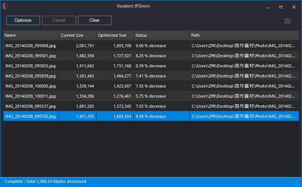 首頁電腦軟體影像繪圖 JPEGMini - JPEG 圖片最佳化,有效減少圖檔大小 常見的數位相機或智慧型手機所拍攝的圖片格式都是 JPEG,且解析度都不低於千萬畫素,一張照片基本都是 1MB起跳,想要將這些圖片分享到網路或儲存都要花掉不少的空間與傳輸時間,如何有效降低圖檔大小,又能保持清晰度,這時候,可以來安裝 JPEGMini 這套免費的應用程式,以節省圖片所占用的硬碟空間與傳輸時間;若是圖片不多,也可以使用網頁版的 JPEGMini 讓你比對縮減前後的差別,相當直覺。 🔔 不錯過任何精彩! 立即訂閱我們的 LINE 官方帳號 每次發佈新文章時,您將會第一時間收到本站文章連結通知,輕鬆掌握最新資訊! 使用 LINE 追蹤文章更新 §相關文章,還可以參閱:告別訂閱制!Canva 旗下 Affinity 永久免費,向量設計、影像處理、排版工具全面開放Pineapple Pictures 載入速度超快的相片檢視器(免安裝)PhotoResizerOK 可快速調整圖片尺寸的免費軟體ShortDoorNote 將輸入的文字快速轉成圖片Bzzt! Image Editor 圖片批次壓縮、轉檔及尺寸調整的免費工具 如何使用 JPEGMini ? 1.完成安裝開啟 JPEGMini 後,將要所檢的 JPEG 圖檔,使用滑鼠拖拉進 JPEGMini 指定位置。 2.點擊[Optimize]便可開始最佳化,完成後,會顯示出檔案精簡的百分比。 JPEGMini版本:1.0語言:英文性質:免費適用:Windows官方網站:http://www.voralent.com/products/jpgmini/下載:按我下載