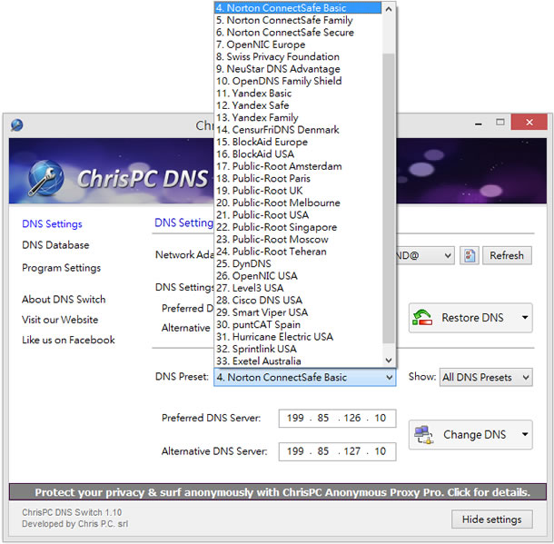 首頁電腦軟體網路應用 ChrisPC DNS Switch 快速切換 DNS 伺服器 Domain Name System(或 Service) 網域名稱解析服務,其最主要功能在將網址與 IP位置進行互相解析。因此,解析速度越快的 DNS 有助於我們取得上網時更好的瀏覽體驗。幾乎各大 ISP 都會提供 DNS 服務,以中華電信為例,168.95.192.1 與 168.95.1.1 應該較為熟悉,Google 也有提供 8.8.8.8 與 8.8.4.4 的 DNS 服務。取得 DNS 不難,較為繁雜的操作是更換 DNS 的步驟,若覺得麻煩,可以來安裝內建有 DNS 資料庫的 ChrisPC DNS Switch 幫你做快速切換 DNS 伺服器的動作。 🔔 不錯過任何精彩! 立即訂閱我們的 LINE 官方帳號 每次發佈新文章時,您將會第一時間收到本站文章連結通知,輕鬆掌握最新資訊! 使用 LINE 追蹤文章更新 §相關文章,還可以參閱:Bright VPN 提供覆蓋全球60多個位置的免費 VPN服務WhoisThisDomain 網域名稱註冊資料免費查詢工具PingInfoView 可自訂時間 PING 自訂的 IP 或網域並發出通知Wireless Network Watcher 找出有哪些裝置正在連你的無線網路IPNetInfo IP 資訊查詢工具 如何使用 ChrisPC DNS Switch? 1.完成安裝,開啟 ChrisPC DNS Switch 後,在 DNS Settings for current network adaper 處,可以看到電腦目前使用的網卡與 DNS 2.可點擊 DNS Preset 處來選擇內建的 DNS Server,選好之後,點擊[Change DNS]便可切換。 ChrisPC DNS Switch版本:4.00語言:英文性質:個人使用免費適用:Windows官方網站:https://changedns.how/下載:按我下載