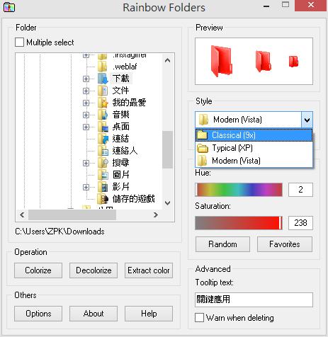 首頁電腦軟體系統應用 Rainbow Folders 替資料夾加上色彩,以利辨識 檔案總管中,對於資料夾及檔案的辨識,可以從檔名、搜尋與排序的方式快速找到所要的資料夾或檔案, 但若能用顏色來辨識,相信對於初學或閱讀較困難的朋友來學,會是一個很好的選擇。想要替資料夾加入顏色辨識,可以來安裝 Rainbow Folders 這套免費工具,除了可替資料夾加入色彩、變更資料夾圖示外,還可以加入浮動提示說明。 🔔 不錯過任何精彩! 立即訂閱我們的 LINE 官方帳號 每次發佈新文章時,您將會第一時間收到本站文章連結通知,輕鬆掌握最新資訊! 使用 LINE 追蹤文章更新 §相關文章,還可以參閱:CatLock:可鎖定鍵盤的 Windows 應用程式,防止寵物意外觸碰Zen Ad blocker 瀏覽器與應用程式均適用的廣告攔截器,免費且開放原始碼TimVer 一站式顯示 Windows 版本及電腦硬體相關訊息的工具「微軟電腦管家」內含開機啟動項目管理、儲存空間最佳化等免費工具 全方位提升電腦效能Windows Startup Timer 測量 Windows 從開機到完全啟動所需時間 如何使用Rainbow Folders? 1.完成安裝,開啟 Rainbow Folders 後,打開檔案總管,在想要變色的資料夾使用滑鼠右鍵點擊 > [Rainbow Folders]。 2.接下來就會開啟資料夾設定視窗。 Multiple Select:勾選後,可選多個資料夾同時設定 Style:可選資料夾樣式 Tooltip text:可輸入滑鼠停留在資料夾所出現的提示文字 Colorize:加入色彩 Decolorize:解除所加入的顏色 3.加入色彩後的資料夾。 Rainbow Folders版本:2.05語言:英文性質:免費適用:Windows官方網站:http://www.english.aionel.net/下載:按我下載
