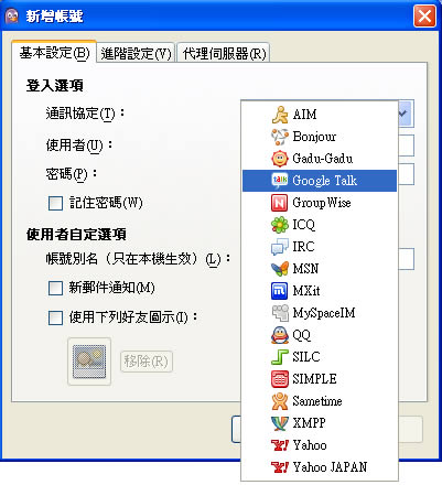 2.安裝完成開啟 Pidgin 主程式,若是第一次使用,會先跳出新增帳號的對話視窗,此時可以輸入MSN (Windows Live Messenger)、Yahoo 奇摩即時通、QQ、Google Talk...等等的帳號,若有多個 MSN 或 Yahoo 奇摩即時通都可以一起輸入,或先輸入一個,稍後可在功能表中點擊[帳號] > [管理帳號]進行帳號的新增、修改及刪除。