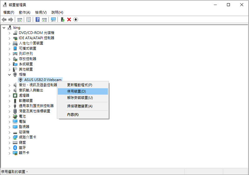 首頁操作技巧Windows 如何停用筆記型電腦上的網路攝影機? 現在的筆記型電腦幾乎都內建有網路攝影機,讓在使用像是 Skype、Facebook 之類的通訊軟體時,除了聲音外,也能呈現對方的即時影像,增加在通話時的真實性與親和力。不過好用歸好用,網路攝影機卻也成為駭客想要擷取的目標,甚至有些通訊軟體預設當通訊時會自動開啟網路攝影機的功能,讓通訊時,也多了風險。若平常不使用,可以停用網路攝影機裝置,確定是與信賴人通訊時再來啟用即可。 🔔 不錯過任何精彩! 立即訂閱我們的 LINE 官方帳號 每次發佈新文章時,您將會第一時間收到本站文章連結通知,輕鬆掌握最新資訊! 使用 LINE 追蹤文章更新 §相關文章,還可以參閱:你的 Windows 筆電是真睡還是裝睡?一個設定終結背包發熱耗電學起來!微軟親授 10 個提升 Windows PC 效能的技巧如何升級 Windows 11 25H2?最新版本功能亮點與完整更新步驟Windows 工作列時鐘顯示秒數:真的會影響電池續航力嗎?LTT Labs 完整實測解析Windows 快速取出資料夾檔案名稱清單!內建功能輕鬆搞定,不用額外軟體 如何停用電腦上的網路攝影機? 1.開啟裝置管理員。 2.展開[ 相機 ],使用滑鼠右鍵點擊裝置名稱來開啟或關閉。