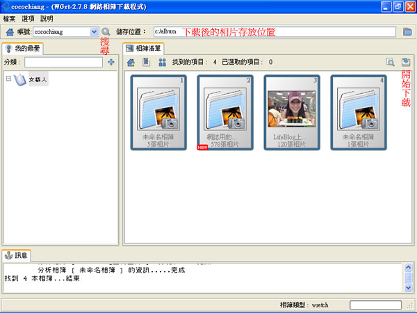 首頁電腦軟體上傳下載 WGet 支援 PChome、痞客邦、Xuite 的網路相簿下載器﹝免安裝繁體中文版﹞ WGet 是一套免費的網路相簿下載程式,支援 Flickr、PChome、Pixnet、Xuite、Yam 等網站所提供的網路相簿服務,與ImCatcher 網路相簿下載程式,支援Pixnet、PBase、Flickr、Facebook、Picasa、PCHome、Xuite、天空部落及攝影家手札藝廊 等下載工具相類似。 🔔 不錯過任何精彩! 立即訂閱我們的 LINE 官方帳號 每次發佈新文章時,您將會第一時間收到本站文章連結通知,輕鬆掌握最新資訊! 使用 LINE 追蹤文章更新 §相關文章,還可以參閱:ArrowDL 全平台下載利器:輕鬆批量下載 YouTube、BT、FB與多站串流影片YouTubePlaylistDownloader 支援播放清單與頻道的 YouTube 影片下載工具,還能轉換格式Parabolic 讓 yt-dlp 更好用的免費影音下載工具,支援上千個網站的影音下載Hasleo Windows ISO Downloader 幫你從微軟網站下載原版 Windows ISO 檔XMusicDownloader 從音樂網站搜尋並下載歌曲的免費應用程式 主要功能: 支援無名、PChome、痞客邦、Xuite等4種網路相簿 同時預覽多本相簿內容 批次下載多個相簿、相片 支援原圖下載 鎖密碼的相簿,可以輸入密碼直接下載 找出好友清單 封面快取,加速瀏覽過的相簿 支援代理伺服器 抓取間隔設定,防止抓太快被擋住 儲存檔案時,允許使用命名規則 跳過已下載的項目 自動檢查最新版本的軟體 書籤管理(我的最愛) 用瀏覽器查看指定的相簿 跨平台,提供Windows、Linux等版本 如何使用 WGet ? 1.下載並解壓縮,免安裝直接執行 WGet.exe 便可開啟 WGet 主程式,以「無名相簿」為例,點擊[選項] > [相簿類型] > [Wretch]。 2.輸入要下載的無名帳號,以「名人堂」內的 蔣怡 為例,輸入帳號後,點擊輸入框右側的搜尋,便會將該帳號所有項列出。 3.選取要下載的相簿後,點擊[開始下載]。 4.下載進度。 5.若受密碼保護,可在上方處輸入密碼。 6.下載後的相簿,包含影音格式檔案一併下載。 WGet版本:2.8.4.8語言:繁體中文性質:免費適用:Windows官方網站:http://laby2.blogspot.com/2010/01/wget.html#download下載:Windows 按我下載 | Linux 按我下載 | Mac