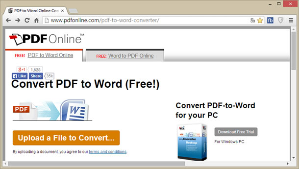 首頁線上工具檔案管理 PDFOnline 線上將 PDF 轉 Word 或 Word 轉 PDF(支援中文) 對於所取得的 PDF 文件,若想要重新編輯,可能很難,但若將其轉為 Word(rtf) 格式再行編輯,可能會比較簡單點。想要將 PDF 轉成 Word ,可以來試試 PDFOnline 這個線上免費服務,不但可將 PDF 轉 Word 亦可將 Word 轉 PDF,支援中文,且格式還能保留,既簡單又方便。 🔔 不錯過任何精彩! 立即訂閱我們的 LINE 官方帳號 每次發佈新文章時,您將會第一時間收到本站文章連結通知,輕鬆掌握最新資訊! 使用 LINE 追蹤文章更新 §相關文章,還可以參閱:VERT:開源本地端檔案格式轉換器,隱私優先的免費瀏覽器轉檔工具PageSplitty 線上 PDF 分割轉 JPG、PNG、WebP 圖工具,支援 5GB 大小的大檔案PixDuplicate:免上傳快速找出並刪除重複照片的免費線上工具Adapter:全方位影片、音檔及圖片格式轉換免費軟體,支援影片轉音檔與圖片,音檔及圖片格式互轉TextCompare 線上比較 Excel、PDF 及圖片,快速找出檔案不同之處 如何使用 PDFOnline ? 1.使用瀏覽器進入 PDFOnline 後(以 PDF 轉 Word 為例),點擊[Upload a File to Convert...]來上傳電腦中的 PDF 文件。 ※PDF 原始檔 2.轉換後,會將內文內嵌到網頁中,可點擊上方的[Download]按鈕,並選擇想要的格式來下載。 3.轉換後的文件,不僅可編輯格式還能保留。 PDFOnline網站網址:http://www.pdfonline.com/pdf-to-word-converter/