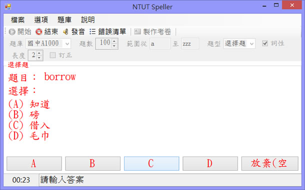 首頁教育學習英文 NTUT Speller 免費英文單字測驗軟體,支援國中基本1000字、國中基本2000字、學測4000字、指考7000字 背英文單字,大概是學習英文的基本功,而教育部也有訂定國中小英文基本單字 1000字、2000字與學測、指考範圍的 7000字彙,這些都是將來生活與升學的基礎英文,想要背熟這些單字,可以透過台北科技大學資訊工程系 陳偉凱教授所開發的 NTUT Speller 這套免費的英文單字測驗軟體,支援國中基本 1000字、國中基本 2000字、學測 4000字、指考 7000字,幫你熟記大部分的單字。 🔔 不錯過任何精彩! 立即訂閱我們的 LINE 官方帳號 每次發佈新文章時,您將會第一時間收到本站文章連結通知,輕鬆掌握最新資訊! 使用 LINE 追蹤文章更新 §相關文章,還可以參閱:Reading Coach: 微軟線上英文學習 AI 工具,幫助提升英文發音準確性Google 「詞彙測驗」,隨時測驗自己對英文單字的識別能力善用「國家圖書館-空中英語教室影音典藏學習系統」免費線上學英語「英文字母」與「數字」筆順練習簿免費下載MvQdict 免費英漢、漢英、英英字典,助你英文更上一層樓 功能與特色: 提供考試「範圍」選擇的功能,能有系統地分段複習。 測驗後,具有「訂正」功能,能針對答錯的字重新測驗,以全部答對為目標。 提供「曾經答錯的字」題庫,隔天或隔一段時間能重複複習這些字。 有自訂題庫功能,能適合不同程度的學生。 提供即時發音,幫助學習正確的發音法。 提供製作考卷的功能,使得不使用電腦時,也可以作測驗。 安裝完畢後,即使沒有網路,也可以進行離線測驗。 如何使用 NTUT Speller ? 1. Windows 各版本安裝過程中,若有問題,可參閱作者所寫:https://myweb.ntut.edu.tw/~wkchen/speller/Installation_note/Windows%2010-Note.htm 安裝說明,點擊[安裝NTUT Speller]後,再點擊[執行],安裝程式會自動幫你安裝所缺少的必要元件。 2.點擊[安裝]。 3.完成安裝後,便會自動開啟,可選擇要測驗的範圍、題型。 4.作答的過程,可隨時點擊[發音]與[錯誤清單]。 5.也可以以考卷的方式來出題測驗(含答案)。 NTUT Speller版本:2.9語言:英文性質:免費適用:Windows官方網站:https://myweb.ntut.edu.tw/~wkchen/下載:前往安裝
