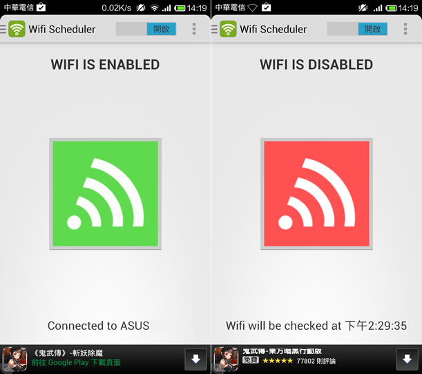 首頁移動設備系統應用 ﹝Android﹞Wifi Scheduler 當無線網路連接點超出範圍時就自動關閉 Wifi,節省電源 在 3G 吃到飽的費率始終居高不下情況,手機利用 Wifi 來上網對沒有 3G或非吃到飽的使用者來說是一個相當好的選擇,不過隨之而來的就是耗電量變高,當我們離開這個 Wifi 連結點,若沒有習慣的去關閉 Wifi,此時的 Wifi 就會不斷的去尋找 Wifi 連結點,造成手機特別耗電,因此,想要管理好無線網路,可以來安裝 Wireless Manager(Wifi Scheduler) 這個應用程式,當我們離開超出這個 Wifi 連結點時,會自動將 Wifi 關閉,並在自訂的時間間隔,檢查是否有可用的 WiFi 並且連接。 🔔 不錯過任何精彩! 立即訂閱我們的 LINE 官方帳號 每次發佈新文章時,您將會第一時間收到本站文章連結通知,輕鬆掌握最新資訊! 使用 LINE 追蹤文章更新 §相關文章,還可以參閱:「Android」如何關閉或開啟「智慧助手」?[ Android ]如何更改預設的瀏覽器?如何使用 Android 系統中內建的 VPN 功能進行 VPN 連線?如何查詢 Android 系統上的 Edge、Chrome 瀏覽器是 32還是 64位元?如何開啟 Android 系統內隱藏的「開發人員選項」功能,方便手機調校? 如何使用 Wireless Manager? 1.完成安裝,開啟 Wireless Manager 後,可以看到目前的無線網路連接狀況;若連接會以綠色的方式顯示,並在其下顯示連接點名稱;若無,則會告訴你下個要檢查有無無線連接點的時間。 2.這個時間,可以點擊左上角的 Wireless Manager 圖示按鈕後,再點擊[Settings],找到 Delay before first check 來調整。 Wireless ManagerAPP性質:免費官方網站:https://play.google.com/store/apps/details?id=com.ryosoftware.wirelessmanager