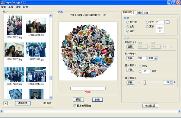 首頁電腦軟體影像繪圖 Shape Collage 可製做任意形狀的相片美術拼貼﹝繁體中文版﹞ Shape Collage 是一套免費的創意美術拼貼製作程式,相較於Google Picasa 內建的固定樣式的美術拼貼,Shape Collage 可以很容易的使用任何形狀的拼貼,不管是矩形、長方形、圓形...甚至可以使用內建的畫筆劃出想要的形狀,然後交給 Shape Collage ,就能產出剛剛使用畫筆所畫出的美術拼貼樣式。 🔔 不錯過任何精彩! 立即訂閱我們的 LINE 官方帳號 每次發佈新文章時,您將會第一時間收到本站文章連結通知,輕鬆掌握最新資訊! 使用 LINE 追蹤文章更新 §相關文章,還可以參閱:告別訂閱制!Canva 旗下 Affinity 永久免費,向量設計、影像處理、排版工具全面開放Pineapple Pictures 載入速度超快的相片檢視器(免安裝)PhotoResizerOK 可快速調整圖片尺寸的免費軟體ShortDoorNote 將輸入的文字快速轉成圖片Bzzt! Image Editor 圖片批次壓縮、轉檔及尺寸調整的免費工具 如何使用 Shape Collage? 1.下載並安裝,安裝完成後開啟 Shape Collage ,將要拼貼的圖片加入左邊的視窗,使用滑鼠拖拉或點擊下方「+」符號,將圖片加入。 2.加入圖片後,點擊[預覽],稍後便會將所選擇的圖片及美術拼貼的型狀進行拼貼﹝相片太少所拼貼的形狀會不好看,建議大約要有100張﹞。 3.點擊[創建],並存檔,便可看見所建立的美術拼貼,存檔時可選擇圖片格式JPG、PNG或PSD。 4.使用不同的形狀建立美術拼貼。除了預設的幾種圖形外, Shape Collage 也可以使用文字及自訂形狀來建立,若要使用文字,點擊[文字],並在後續的設定視窗中,輸入文字﹝可以是中文﹞後,點擊[關閉]。 5.按前述建立美術拼貼步驟建立。 6.使用自訂圖形,可以使用筆刷自訂形狀或由右上角載入預設圖形。 7.按前述建立美術拼貼步驟建立。 Shape Collage版本:2.5語言:繁體中文(多國語言)性質:免費適用:Windows | Linux | Mac OSX官方網站:http://www.shapecollage.com/下載: 按我下載 Mac、Linux 按我前往下載