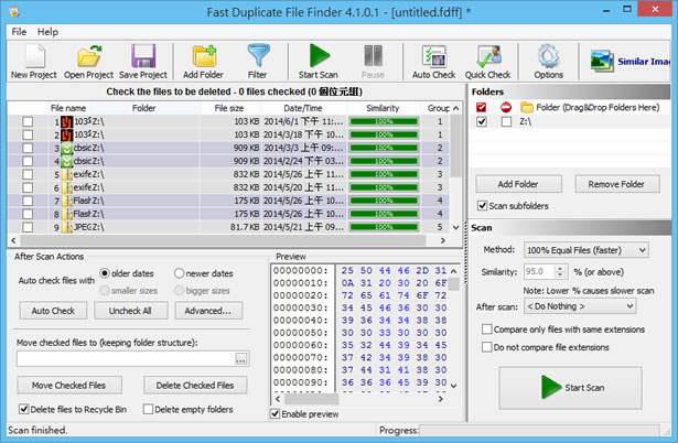 首頁電腦軟體檔案管理 Fast Duplicate File Finder 重複檔案搜尋與刪除免費工具 若未做好檔案管理,隨著日積月累的下載、複製、更名等操作習慣,檔案重複的問題便會越來越嚴重,想要刪除,卻又怕刪除到只有一份的檔案,有點麻煩,這時候,可以來試試 Fast Duplicate File Finder 這套可自訂相似度、搜尋速度又快的檔案比對與刪除免費工具。 🔔 不錯過任何精彩! 立即訂閱我們的 LINE 官方帳號 每次發佈新文章時,您將會第一時間收到本站文章連結通知,輕鬆掌握最新資訊! 使用 LINE 追蹤文章更新 §相關文章,還可以參閱:檔案好多重複怎麼辦?免費 dupeGuru 幫你一鍵清出電腦空間[ 免費使用 ]PDFgear 整合各種 PDF 工具,具格式轉換、編輯、合併或拆分等功能7-Zip 檔案壓縮與解壓縮免費軟體AmoK Exif Sorter 讓照片按拍照日期重新命名並自動分類的免費軟體PDF Unshare 限制 PDF 檔案的讀取有效日期 如何使用 Fast Duplicate File Finder? 1.完成安裝,開啟 Fast Duplicate File Finder 後,點擊[Add Folder]來加入要比對的資料夾,加入後,點擊[Start Scan]。 2.比對完成後,便會列出統計。 3.接下來針對以重複的檔案,可以選擇[Auto Check]或手動來選取,確定後,可以點擊[Delete Checked Files]來刪除。 Fast Duplicate File Finder版本:6.3.0.1語言:英文性質:免費適用:Windows官方網站:https://www.mindgems.com/products/Fast-Duplicate-File-Finder/Fast-Duplicate-File-Finder-About.htm下載:按我下載