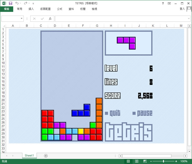 首頁電腦軟體益智遊戲 用 Excel 玩俄羅斯方塊 俄羅斯方塊是個百玩不膩、老少咸宜的經典遊戲,玩家必須將系統所出的方塊形狀在掉落前進行翻轉成適當的角度以利與下方存在的方塊進行組合,所結合出的大方塊中間不能有缺需緊密結合才能消去層疊的塊狀物,考驗玩家的組合能力。想玩「俄羅斯方塊」的遊戲不論是 Windows 、網頁型或是 Android 都有很多的選擇,不過你可以試試這個同樣是利用上、下、左、右鍵來操控方塊角度與下降速度的 Excel 版的「俄羅斯方塊」遊戲。 🔔 不錯過任何精彩! 立即訂閱我們的 LINE 官方帳號 每次發佈新文章時,您將會第一時間收到本站文章連結通知,輕鬆掌握最新資訊! 使用 LINE 追蹤文章更新 §相關文章,還可以參閱:Retr0Mine:免安裝經典踩地雷遊戲,可選挑戰難易度「象棋巫師」大師級的免費象棋遊戲(免安裝版)用 Excel 玩 Angry Birdsbpuzzle 好玩的拼圖遊戲EclipseCrossword 英文填字遊戲產生器 如何使用 「俄羅斯方塊」? 1.使用 Excel 開啟解壓縮的檔案,便會出現遊戲選項,可以點擊[Play]來選擇遊戲等級(共 10等級)。 2.利用鍵盤上、下、左、右鍵來操控方塊角度與下降速度。 Excel版的 「俄羅斯方塊」性質:免費下載:按我下載(38.1 KB)