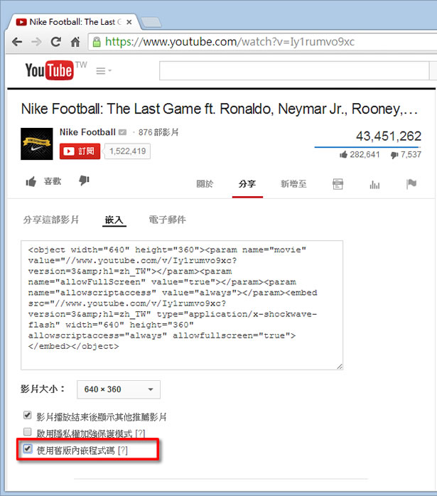 首頁操作技巧Google 如何讓 Youtube 影片從指定的時間開始播放? 在網路上進行創作時,想要在網頁裡嵌入 Youtube 中的影片,是件相當容易的事情,Youtube 在每部影片均有提供分享 -> 嵌入到網頁的語法,只需複製後貼到網頁想要呈現處即可,輕鬆又方便。不過若影片很長或想讓讀者可以從自己敘述的影片位置中開始播放,可以試試在嵌入網頁的語法中加入時間控制,讓自己的創作可以更生動。 🔔 不錯過任何精彩! 立即訂閱我們的 LINE 官方帳號 每次發佈新文章時,您將會第一時間收到本站文章連結通知,輕鬆掌握最新資訊! 使用 LINE 追蹤文章更新 §相關文章,還可以參閱:別再只會用兩指縮放 Google 地圖了!這些隱藏手勢讓你效率翻倍照著做就會!Google 官方釋出 NotebookLM 簡報製作的 8 種範例教學機車族專屬!Google Maps 推出 5 款超萌機車圖示 × 8 種顏色,設定步驟看這篇Google Skills:3000+ 門課程助你打造 AI 時代競爭力Google Vids 全解析:一文看懂功能、免費版限制及完整操作步驟 如何讓 Youtube 影片從指定的時間開始播放? 1.首先先取得嵌入網頁語法,每部影片在播放框下方的[分享] > [嵌入]處,可以取得嵌入到網頁的語法(請勾選使用舊版內嵌程式碼)。 2.在該段語法處,加入影片要播放的開始位置(時間)。 <object width="640" height="360"><param name="movie" value="//www.youtube.com/v/Iy1rumvo9xc? version=3&hl=zh_TW&start=168"></param><param name="allowFullScreen" value="true"></param><param name="allowscriptaccess" value="always"></param><embed src="//www.youtube.com/v/Iy1rumvo9xc? version=3&hl=zh_TW&start=168" type="application/x-shockwave- flash" width="640" height="360" allowscriptaccess="always" allowfullscreen="true"></embed></object> 168 為秒數
