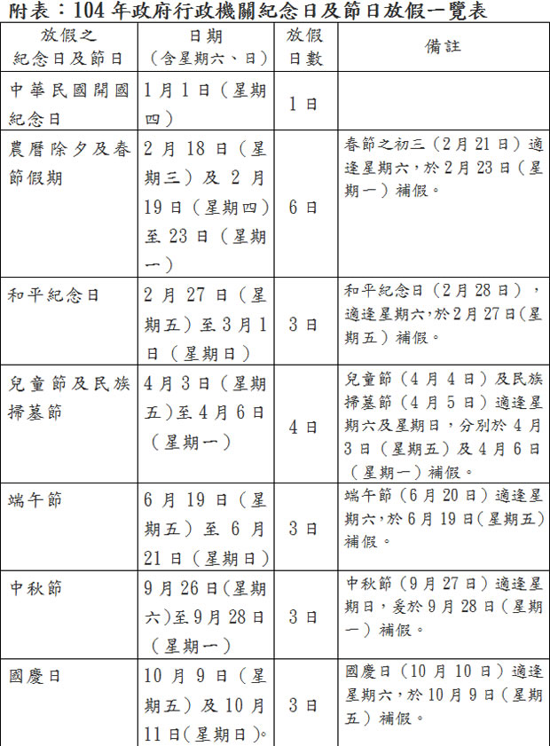首頁電腦軟體生產力工具 104年連續放假日一覽表,放假日遇星期六、日確定補假 想要預先安排明年出差、旅遊行程,可先來參考表示,行政院已核定的明(104)年政府行政機關辦公日曆表,104年 3天以上的連假將有 6次,其中兒童節及清明節連假達 4天,總放假日數共115日。紀念日及節日之放假日逢例假日一律補假,逢星期六於前一個上班日補假,逢星期日於次一個上班日補假。但農曆除夕及春節放假日逢例假日,均於次一個上班日補假。 🔔 不錯過任何精彩! 立即訂閱我們的 LINE 官方帳號 每次發佈新文章時,您將會第一時間收到本站文章連結通知,輕鬆掌握最新資訊! 使用 LINE 追蹤文章更新 §相關文章,還可以參閱:AingDesk:一鍵安裝 Ollama AI 模型管理器,讓 LLaMA、DeepSeek 在本機電腦上運行Arc 瀏覽器正式登陸 Windows 11,開啟全新瀏覽體驗!Norton Secure Browser 使用 Chromium 核心的瀏覽器,有廣告封鎖和隱私保護功能BingGPT 桌面應用程式,讓你不用 Edge 也能用 Bing 聊天機器人SlippyClerk 數字、英文字母有序字串產生器 可自訂前後綴字詞 104年連續放假日一覽表 檔案格式為 PDF,可安裝Adobe PDF Reader 或使用 Google Chrome 瀏覽器來開啟,可參閱 透過 Google Chrome 瀏覽器直接開啟 PDF 檔案。 104年連續放假日一覽表官方網站:http://www.dgpa.gov.tw/ct.asp?xItem=11525&ctNode=1287&mp=7下載:104年連續放假日一覽表(來源行政院人事行政總處) 按我下載