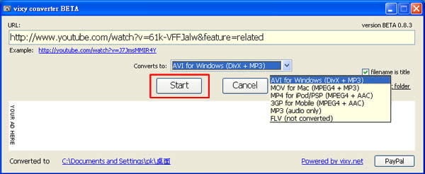 首頁電腦軟體影音視聽 vixy converter Youtube影片轉檔﹝AVI、MOV、MP4、MP3、3GP﹞及下載 vixy converter 是一套將 Youtube 影片轉檔及下載的免費應用程式,只要輸入 Youtube 影片的網址,就可將 Youtube 的影片轉檔成 AVI、MOV、MP4、MP3、3GP 等格式,並儲存到自己的電腦裡,使用起來非常直覺。vixy 也有提供線上轉檔服務,如果不想安裝 vixy converter 也可以試試它的線上服務,一樣是免費的。 🔔 不錯過任何精彩! 立即訂閱我們的 LINE 官方帳號 每次發佈新文章時,您將會第一時間收到本站文章連結通知,輕鬆掌握最新資訊! 使用 LINE 追蹤文章更新 §相關文章,還可以參閱:超實用免費軟體!DCP-o-matic 讓你的影片變成電影院 DCP 播放格式語音轉文字免費工具 AsrTools 輕鬆搞定字幕、筆記或歌詞整理免費的 PotPlayer 開始搭載 Whisper AI,讓你即時生成字幕與翻譯,外語影片輕鬆看SpleeterGUI:簡單易用的 AI 音軌分離免費開源工具如何使用 Microsoft Clipchamp 自動產生影片字幕? 如何使用Client for Google Translate? 1.下載並安裝,安裝完成後開啟 vixy converter 應用程式,輸入到URL輸入框,接下來選擇要轉換的影片格式,輸入及選擇好之後,點擊[Start]就會開始進行格式轉檔。 2.接下來就會出現轉檔進度,轉檔完成後便可在存檔路徑找到該檔案。 3.vixy 也有提供線上轉檔服務 ,操作的方法與前述幾乎一樣,任君選擇。 vixy converter版本:0.8.3語言:英文性質:免費適用:Windows官方網站:http://vixy.net/下載:按我下載