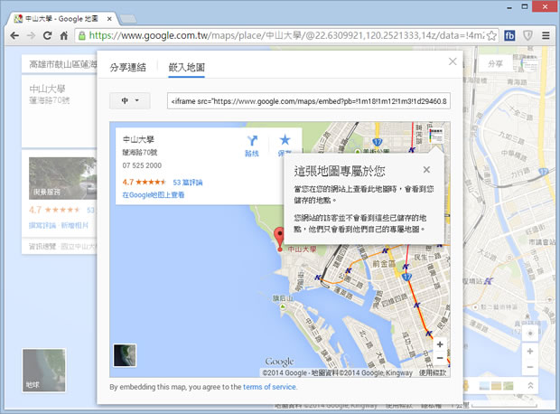 首頁線上工具網頁瀏覽 如何在網頁中嵌入 Google 地圖與街景圖? 當需要在網頁或自己的部落格中向使用者介紹地點或地址時,可以來使用 Google 的地圖與街景圖服務,只需簡單的步驟便能將所要介紹的地點或地址利用地圖或街景圖的方式來呈現,讓使用者更清楚的了解目地的的周遭與樣貌。 🔔 不錯過任何精彩! 立即訂閱我們的 LINE 官方帳號 每次發佈新文章時,您將會第一時間收到本站文章連結通知,輕鬆掌握最新資訊! 使用 LINE 追蹤文章更新 §相關文章,還可以參閱:Google 搜尋『67』會發生什麼事?網友實測驚呼:螢幕活了!Google 2025 台灣年度搜尋榜:地震、普發現金、Gemini,我們都在找什麼?ChatGPT Atlas 瀏覽器問世:三大 AI 功能顛覆你的上網方式Microsoft Rewards 點數全自動狂賺法,一鍵設定、天天進帳!如何將 DeepSeek 安裝成應用程式? 如何在網頁中嵌入 Google 地圖? 1.使用瀏覽器進入 Google 地圖,將地點或地址鍵入左上角的搜尋框中,待地圖顯示到正確地點後,按右下角的齒輪圖示 > [分享和嵌入地圖]。 2.切換到嵌入地圖的頁籤便可看到嵌入的語法,複製該語法,貼到網頁要呈現的位置即可。 如何使用在網頁中嵌入 Google 街景圖? 1.使用瀏覽器進入 http://ctrlq.org/maps/embed/ 這個專門用來嵌入Google地圖的網站,鍵入想嵌入街景圖的位置,然後將畫面左方的「小黃人」拖曳到馬路上。 2.複製 iframe 語法,貼到網頁要呈現的位置即可。