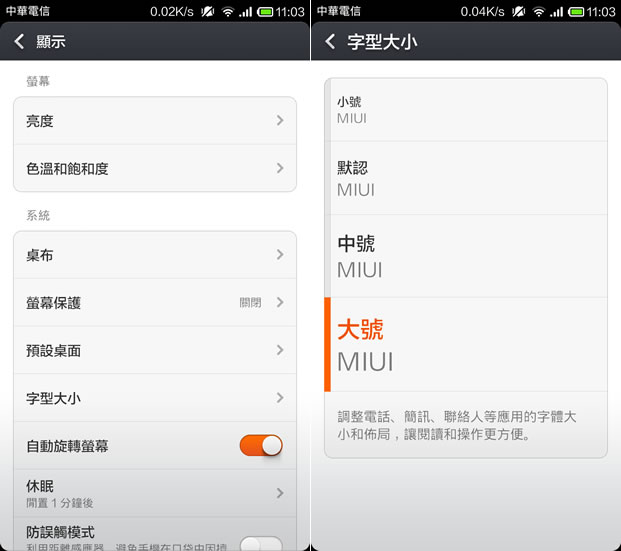 首頁移動設備系統應用 ﹝Android﹞如何變更介面字體大小? 解析度越高的智慧型手機或平板設備,伴隨而來的就是字體越小,這對小朋友或有老花眼使用者而言,前者加快近視的速度,而對後者更是難以適應,常常需要戴起老花眼鏡才能撥電話或使用其他的功能,若有這些考量,我們可適時的調整介面所呈現的字體大小,以符合自己的使用習慣。 🔔 不錯過任何精彩! 立即訂閱我們的 LINE 官方帳號 每次發佈新文章時,您將會第一時間收到本站文章連結通知,輕鬆掌握最新資訊! 使用 LINE 追蹤文章更新 §相關文章,還可以參閱:「Android」如何關閉或開啟「智慧助手」?[ Android ]如何更改預設的瀏覽器?如何使用 Android 系統中內建的 VPN 功能進行 VPN 連線?如何查詢 Android 系統上的 Edge、Chrome 瀏覽器是 32還是 64位元?如何開啟 Android 系統內隱藏的「開發人員選項」功能,方便手機調校? 如何變更 Android 作業系統介面字體大小? 1.設定 > 顯示。 2.點擊[字型大小]後,在設定頁面選擇合適的字體大小。