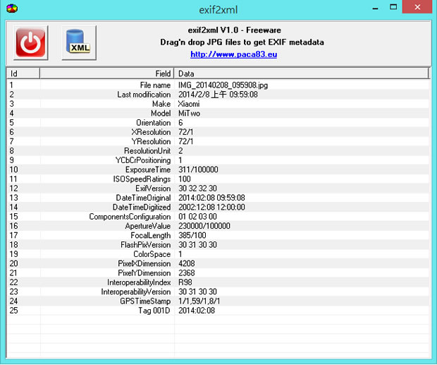 首頁電腦軟體影像繪圖 exif2xml 將相片的 EXIF 資訊轉成 XML 檔案 數位相片的檔案,雖然看起來與一般相片無異,但其另存有 EXIF 資訊在其中,想要檢視這些資訊,最快速的方式便是利用滑鼠右鍵點擊照片檔案,再點擊[內容]便可看出簡易的 EXIF 資訊,想要將這些資訊轉存成 XML 檔案,以方便後續的應用,可以來試試 exif2xml 這個免費的應用軟體,免安裝,且操作簡單。 🔔 不錯過任何精彩! 立即訂閱我們的 LINE 官方帳號 每次發佈新文章時,您將會第一時間收到本站文章連結通知,輕鬆掌握最新資訊! 使用 LINE 追蹤文章更新 §相關文章,還可以參閱:告別訂閱制!Canva 旗下 Affinity 永久免費,向量設計、影像處理、排版工具全面開放Pineapple Pictures 載入速度超快的相片檢視器(免安裝)PhotoResizerOK 可快速調整圖片尺寸的免費軟體ShortDoorNote 將輸入的文字快速轉成圖片Bzzt! Image Editor 圖片批次壓縮、轉檔及尺寸調整的免費工具 如何使用 exif2xml ? 1.解壓縮所下載的檔案,執行「exif2xml.exe」便可開啟,無須安裝。開啟後,將相片使用滑鼠拖拉到介面空白處,即可顯示該張相片的 EXIF 資訊,點擊上方有 XML的按鈕,便可轉出。 2.轉出後,可使用記事本或 Excel 取得外部資料的方式來匯入開啟。 exif2xml版本:1.0語言:英文性質:免費適用:Windows官方網站:http://www.paca83.eu/downloads.asp下載:按我下載