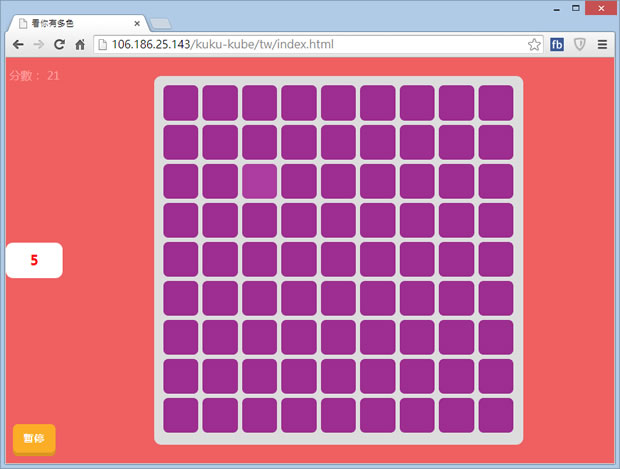 首頁線上工具益智遊戲 「看你有多色」辨識圖中不同顏色的色塊 「看你有多色」是一個辨識色差的網頁遊戲,遊戲中會不斷的變換顏色與增加色塊,而其中會有一個色塊與其他的色塊顏色不一樣,因其顏色都很相近,玩家須在時間內辨識出最多的的不同題數,遊戲會以不同的答題數給予不同的評語。 🔔 不錯過任何精彩! 立即訂閱我們的 LINE 官方帳號 每次發佈新文章時,您將會第一時間收到本站文章連結通知,輕鬆掌握最新資訊! 使用 LINE 追蹤文章更新 §相關文章,還可以參閱:Google Doodle 萬聖節遊戲登場!小精靈 45 週年特別版完整介紹毫秒級反應力大挑戰!用 Reaxon 訓練大腦、眼睛與手的協調反應2048 Cupcakes 經典單人 2048 滑塊線上遊戲,AI 輔助輕鬆挑戰高分免費線上拼圖遊戲平台:iLoveJigsaw 可自行上傳圖片製作拼圖Songlio:線上聽音樂猜歌曲名稱遊戲,可自訂歌曲題庫並與多人一起挑戰 如何玩「看你有多色」? 1.使用瀏覽器進入「看你有多色」網站後,點擊[遊戲開始]。 2.遊戲一開始會以大色差與大色塊進行引導,玩家只需使用滑鼠去點擊不同的色塊,若答對便會進行下一個辨識題目,隨著答對題數的增加,色塊會越變越小且色差會越來越相近。 3.直到時間終了,便會依據答題數給出評語。 看你有多色網站網址:http://freesoyo.com/h5g/201504181/rrsilk/