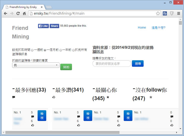 首頁線上工具社群與通訊 Facebook Friend Mining - Facebook 朋友互動數據分析工具,找出最多回應、按讚最多、沒 follow 你的朋友 Facebook 已成為很多人每天與朋友互動的主要工具,不過有些人朋友數很多,但友互動的總是那幾個,想分析自己朋友與自己互動的關係,可以來 Facebook Friend Mining 這個可以以周、月、年為單位來分析與朋友間互動關係的線上分析統計工具,幫你統計出最多回應、按讚最多、沒 follow 你的朋友等相關數據,讓朋友間的互動能更為有效率。 🔔 不錯過任何精彩! 立即訂閱我們的 LINE 官方帳號 每次發佈新文章時,您將會第一時間收到本站文章連結通知,輕鬆掌握最新資訊! 使用 LINE 追蹤文章更新 §相關文章,還可以參閱:馬上爆富超好用!LINE Bank × 胸毛公寓招財貼圖,農曆新年免費領取馬年行大運!精選8款新春招財LINE免費貼圖,OPEN將、罐頭豬陪你過好年「LINE 社群」也能開店!打通聊天到下單的最後一哩路存發票也能玩遊戲!LINE 發票管家改版重點一次看LINE 教你玩轉 2025聖誕節!召喚熊大特效、秒送禮物、搶免費貼圖全攻略 如何使用 Facebook Friend Mining? 1.使用瀏覽器進入 Facebook Friend Mining 網站後,點擊[開始玩]。 2.按[確定]登入自己的帳號。 3.視需求,選擇用周、月、年並點擊[開始]來分析數據。 4.稍後一下下,便會列出統計數據,供你參考。 Facebook Friend Mining網站網址:http://ensky.tw/FriendMining/