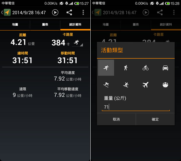 首頁移動設備生活資訊 ﹝Android﹞「Google 我的足跡」紀錄散步、路跑、騎車、開車等過程,並計算消耗卡路里 每天適量的運動,不論是散步、慢跑、騎自行車、游泳......等對身體健康都會有一定的幫助,針對戶外的運動,最簡單也最方便的便是路跑、騎單車,若想記錄運動的路線、里程數、所在海拔高度、速度、運動時間,甚至是所消耗的卡路里等,可以透過 Google 所開發的「我的足跡」這個應用程式,其會將每次的運動路線結合地圖來呈現,並統計所運動的里程數、所在海拔高度、速度、運動時間,甚至是所消耗的卡路里等做出詳細的分析與統計,讓運動過程更有依據,並調整自己的運動習慣。 🔔 不錯過任何精彩! 立即訂閱我們的 LINE 官方帳號 每次發佈新文章時,您將會第一時間收到本站文章連結通知,輕鬆掌握最新資訊! 使用 LINE 追蹤文章更新 §相關文章,還可以參閱:停車不再靠運氣!用 LINE「雞來客棧_GLike」機器人 3秒快速找車位Google Play 公布 2023 年度最佳遊戲及應用程式榜單「中央氣象局E-地震測報」APP即時掌握地震動態手機開啟 Google 搜尋「Pac-Man」就讓 Hello Kitty、小精靈、布丁狗及動漫人物以 3D 出現在現實環境中手機開啟 Google 搜尋動物名稱,就可利用 AR 技術將其融入到現實環境中 如何使用「我的足跡」? 1.完成安裝,欲使用「我的足跡」需開啟定位中的「GPS衛星定位」與「位置資訊與Google 搜尋」,開啟「我的足跡」後,會顯示先前的紀錄,要開始紀錄時,需點擊左下角的紅色圓形按鈕。 2.即便在無網路的服務下,「我的足跡」依然會記錄經、緯度,讓你在有網路時,可利用地圖檢視運動路線,切換到圖表頁籤,可顯示海拔與運動速度。 3.統計資料,則可統計運動距離、總時間、移動時間、速限、平均速度、平均移動速度,並可根據自己的體重與運動類型(點擊卡路里下的運動圖形旁的三角形按鈕)計算所消耗的卡路里。 4.要想結合 Google 地球,可點擊如下左圖的紅色框按鈕;想要分享數據,可以點擊如下右圖的紅色框按鈕。 5.想要將資料匯出,可點擊如下左圖紅色框內的按鈕來操作。 我的足跡APP性質:免費官方網站:https://play.google.com/store/apps/details?id=com.google.android.maps.mytracks&hl=zh_TW
