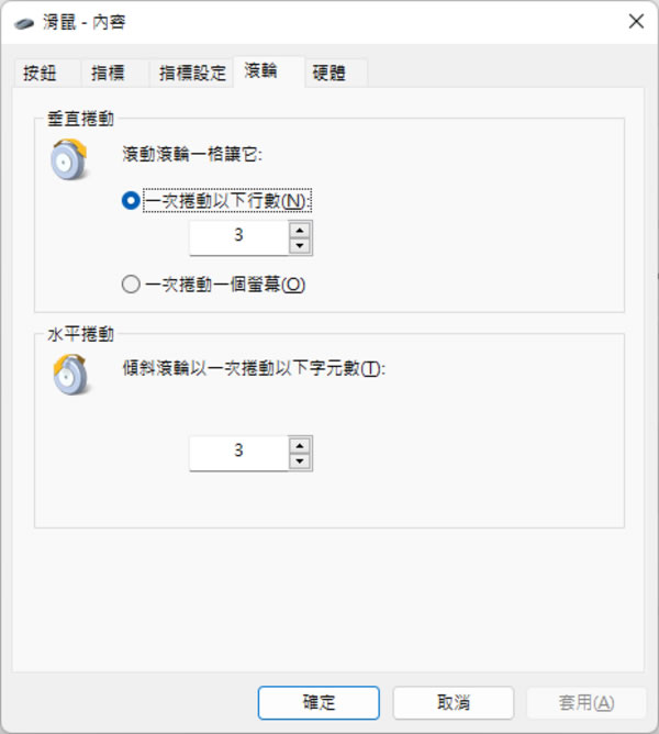 首頁操作技巧Windows 「Windows」如何調整滑鼠滾輪滾一格所要移動的行數? 利用滑鼠操作瀏覽器時,每當要將內容向下捲動的時候,通常會利用滑鼠直接拖動瀏覽器右側所出現的捲動條,或是利用滾動滑鼠中間的滾輪來上、下移動內容,第一種方式需要壓住滑鼠的左鍵來操作,適合快速找到想看的位置,而第二種方式則適合需仔細閱讀的時機,以第二種方式來操作時,Windows 系統預設的是滾動一格會移動 3行,若希望加大或減少移動的行數來配合自己的習慣或操作上的需求,我們可以透過[ 設定 ]來進行調整。 (本篇設定方法,適用 Windows 10 與 11版本) 🔔 不錯過任何精彩! 立即訂閱我們的 LINE 官方帳號 每次發佈新文章時,您將會第一時間收到本站文章連結通知,輕鬆掌握最新資訊! 使用 LINE 追蹤文章更新 §相關文章,還可以參閱:你的 Windows 筆電是真睡還是裝睡?一個設定終結背包發熱耗電學起來!微軟親授 10 個提升 Windows PC 效能的技巧如何升級 Windows 11 25H2?最新版本功能亮點與完整更新步驟Windows 工作列時鐘顯示秒數:真的會影響電池續航力嗎?LTT Labs 完整實測解析Windows 快速取出資料夾檔案名稱清單!內建功能輕鬆搞定,不用額外軟體 如何調整滑鼠滾輪滾一格所要捲動的行數? Windows 11設定方法: 1.Windows 11 設定滑鼠滾輪滾一格要捲動行數的方法,其實與 Windows 10一樣,同樣在開啟設定視窗,選擇[ 滑鼠 ]。 2.調整滾輪滾一格所要捲動的行數。 3.也可以透過[ 其他滑鼠設定 ]來設定。 Windows 10 設定方法: 1.開啟[ 設定 ] > [裝置]。 2.切換到滑鼠頁籤,便可依需求加大或減少滾輪滾一次所要捲動的行數。 3.如果是大的影像,需要捲動更多格數,也可以選擇[ 一次捲動一個螢幕 ]。