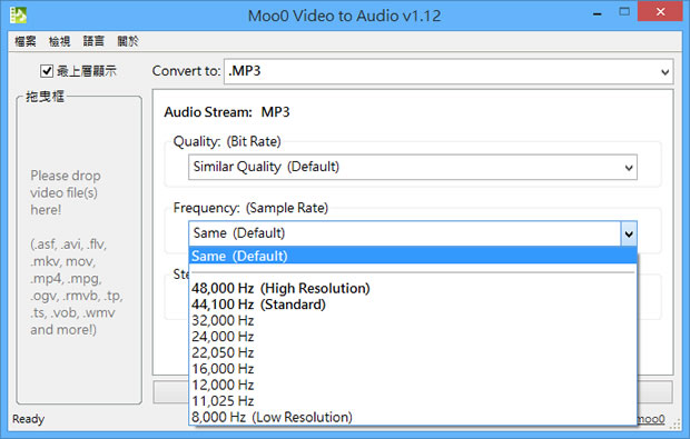 首頁電腦軟體影音視聽 Moo0 Video to Audio 取出影片中的音樂 影片中的配樂,常有讓人想一聽在聽的慾望,聽著音樂,總能讓人回想影片中的片段,不過並不是影片中的配樂都額外有出版專輯可供購買,想要取得這些配樂,可以使用 Moo0 Video to Audio 這套免費的應用程式自己動手來取出,操作簡單轉檔速度快。 🔔 不錯過任何精彩! 立即訂閱我們的 LINE 官方帳號 每次發佈新文章時,您將會第一時間收到本站文章連結通知,輕鬆掌握最新資訊! 使用 LINE 追蹤文章更新 §相關文章,還可以參閱:超實用免費軟體!DCP-o-matic 讓你的影片變成電影院 DCP 播放格式語音轉文字免費工具 AsrTools 輕鬆搞定字幕、筆記或歌詞整理免費的 PotPlayer 開始搭載 Whisper AI,讓你即時生成字幕與翻譯,外語影片輕鬆看SpleeterGUI:簡單易用的 AI 音軌分離免費開源工具如何使用 Microsoft Clipchamp 自動產生影片字幕? 如何使用 Moo0 Video to Audio? 1.完成安裝,開啟 Moo0 Video to Audio 應用程式後,可先在 Convert to 處,選擇要轉出的聲音檔案類型。 2.若需要設定該檔案類型的參數,可點擊[進階選項>>]來調整。 3.調整完成後,點擊[最小化>>]回到原來視窗,將要轉檔的影片使用滑鼠拖拉到介面拖曳框內,便會自動開始轉檔。 Moo0 Video to Audio版本:1.18語言:中文性質:免費適用:Windows官方網站:https://zhs.moo0.com/?top=https://zhs.moo0.com/software/VideoToAudio/下載:按我下載