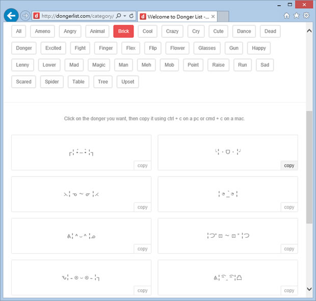 首頁線上工具社群與通訊 Donger List 表情符號線上免費應用 想要在文字間增加些趣味性,加入一些表情符號是個不錯的選擇,Donger List 是個提供表情符號的線上免費應用網站,其將表情符號進行分類,讓你可以快速找到自己適合的應用,使用時,也只需複製再貼到要應用的文書或通訊軟體上即可,另外,網站上還提供創作自己表情符號的工具,讓表情符號可更多樣性。 🔔 不錯過任何精彩! 立即訂閱我們的 LINE 官方帳號 每次發佈新文章時,您將會第一時間收到本站文章連結通知,輕鬆掌握最新資訊! 使用 LINE 追蹤文章更新 §相關文章,還可以參閱:LINE「偵測可疑網站」功能設定教學:3步驟啟用,有效防範詐騙連結小紅書被封怎麼辦?免 VPN!5 分鐘教你用 DNS 快速解決LINE 官方親授換機教學,帳號轉移、備份、登入完整換機流程指南Instagram Reels 五大新功能:20 分鐘錄影、美顏調整、一鍵復原別讓 LINE 帳號消失!四大必備設定保護你的好友與聊天記錄 如何使用 Donger List? 1.使用瀏覽器進入 Donger List 後,會列出所有的表情符號。 2.可點擊分類來找尋適用的表情符號,需用時,僅需點擊符號旁的[Copy]即可貼到想應用處。 3.想要自己建立新的表情符號,可以點擊[Create a Donger]來建立。 Donger List網站網址:http://dongerlist.com/