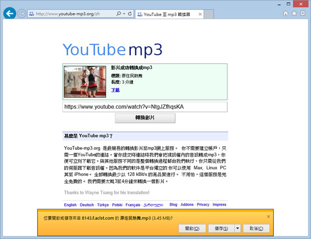 首頁線上工具影音視聽 YouTube mp3 - YouTube 影片轉 mp3 線上服務 YouTube 除了有看不完的影片,更包含有好聽的歌曲 MV,甚至很多歌星的專輯的主打歌首發,也都會選擇在 YouTube,想要取得這些影片的聲音檔,這時候我們可以透過 YouTube mp3 這個操作相當簡單的 YouTube 影片轉 mp3 線上服務,只要貼上 YouTube 影片網址,接下來就是下載,完全沒有多餘的操作步驟,相當實用。 🔔 不錯過任何精彩! 立即訂閱我們的 LINE 官方帳號 每次發佈新文章時,您將會第一時間收到本站文章連結通知,輕鬆掌握最新資訊! 使用 LINE 追蹤文章更新 §相關文章,還可以參閱:sound&go 耳機測試工具:免安裝測左右聲道、頻率響應Veo 3.1「材料轉影片」功能升級:支援直式影片與 4K 畫質來了!OpenAI Sora Android 版上線 Google Play,台灣用戶同步開放Google 親授 Veo 3.1 用電影語言與音效設計打造完美 AI 影片Sora Watermarker:一鍵為影片加上 OpenAI Sora 浮水印 如何使用 YouTube mp3 ? 1.使用瀏覽器進入 http://www.youtube-mp3.org/zh 網站後,將複製好的 YouTube 網址,貼到輸入框內後,點擊[轉換影片]。 2.接下來直接點擊[下載],便可將 mp3 檔案下載回自己的電腦裡。 YouTube mp3網站網址:http://www.youtube-mp3.org/zh