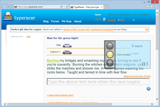 首頁教育學習打字練習 typeracer 線上邊玩賽車遊戲邊練英文打字 電腦內的各項應用軟體要用的好用的順,打字是個重要關鍵,不論是中文或英文打字,總要下點功夫練習。打字如何練?當然是透過工具軟體來練習才能事半功倍,若覺得尋常的打字應用軟體只有時間的限制,缺乏使用動力,可以來試試 typeracer 這個線上就可使用的英文打字練習免費服務,其將打字速度換成是你駕駛的賽車,另台賽車則是系統來駕駛,兩台車比速度,另外亦提供自我練習與好友對戰模式。 🔔 不錯過任何精彩! 立即訂閱我們的 LINE 官方帳號 每次發佈新文章時,您將會第一時間收到本站文章連結通知,輕鬆掌握最新資訊! 使用 LINE 追蹤文章更新 §相關文章,還可以參閱:Live Typing Test:免費線上英文打字測試,提升速度與準確率typings:多語言線上免費打字練習工具,專為提升打字技能而設計Monkeytype 線上英打練習免費服務 快速提升打字速度與正確率TypingCat 提供英文打字課程、速度測試的免費網站「花蓮縣打字練習網」線上中、英文及注音符號打字練習 如何使用 typeracer 1.使用瀏覽器進入 typeracer 後,可選擇要練習的模式。 2.賽車模式,模仿倒數至綠燈亮起,即是比賽開始,將輸入欄上方所出現的文字,依序無誤的輸入,每輸入一個字,便能驅動自己的賽車往前。 ※自我練習模式,基本同賽車模式,只是沒有系統的賽車 3.好友對戰模式,可將出現的邀請網址,複製後,傳給好友邀他一起對戰。 typeracer網站網址:http://play.typeracer.com/